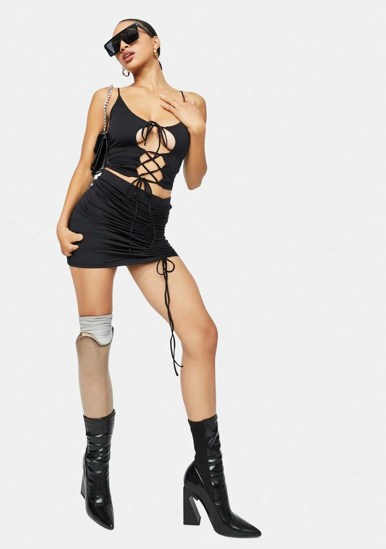cuz you have to keep it lit. This set has a ruched tie front top and matching skirt.
