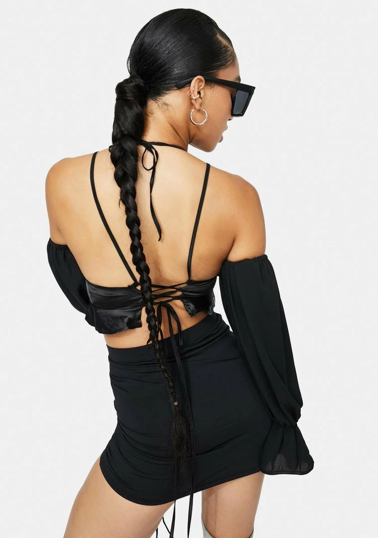 cuz you are always making moves. This satin crop top has an off the shoulder design, detached puff sleeves with flared cuffs, and adjustable tie back closures.