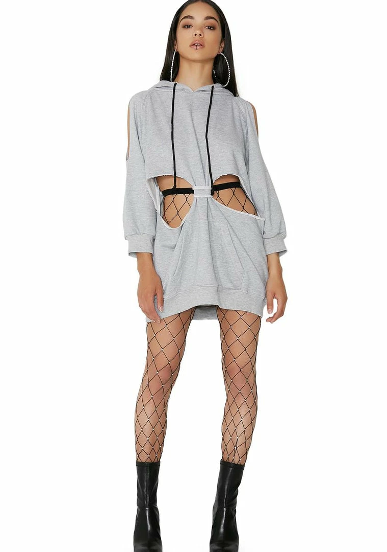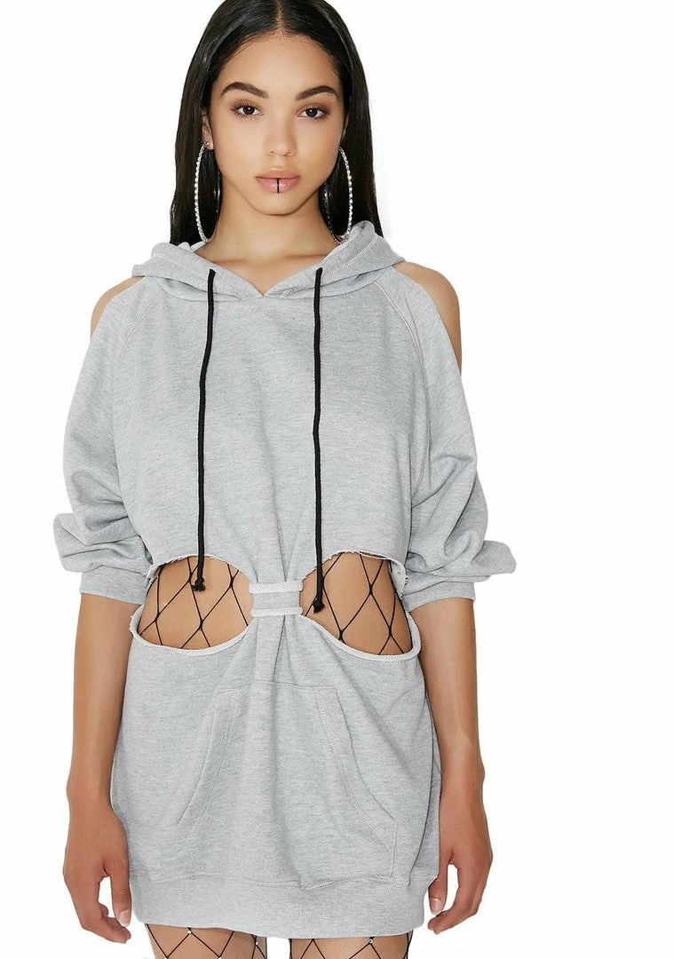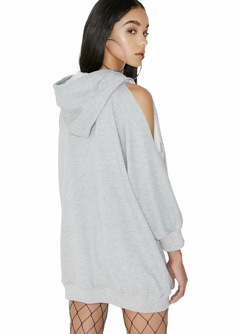 who runs the world, babe? This sikk af sweatshirt dress has an oversized fit, sexxy front cut-out detail, cold shoulders and cropped sleeves.