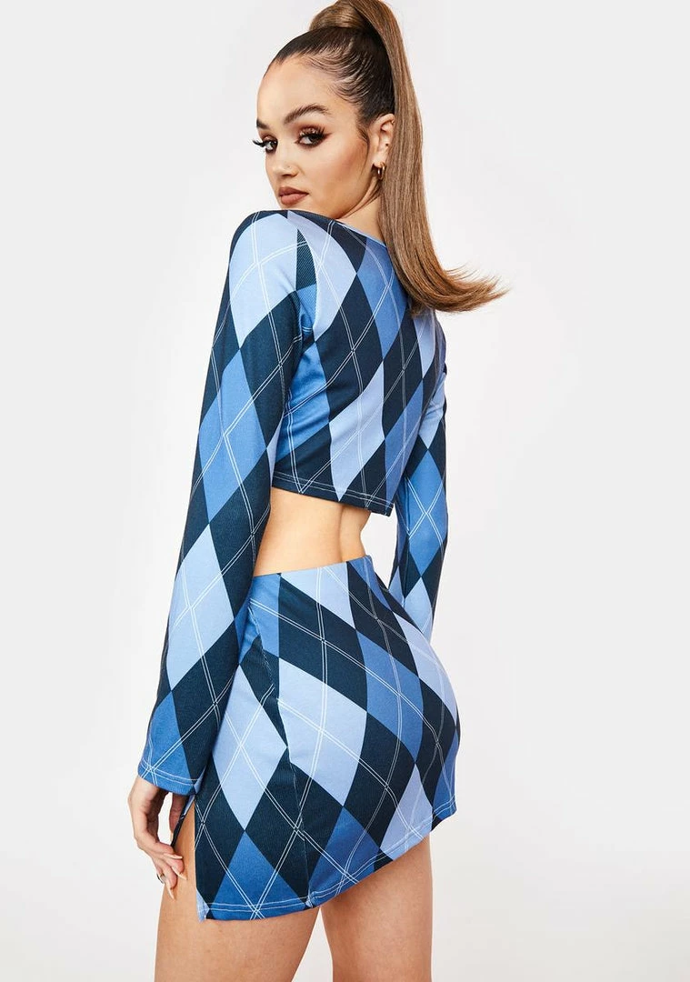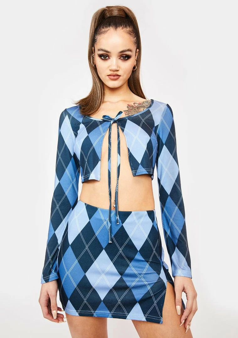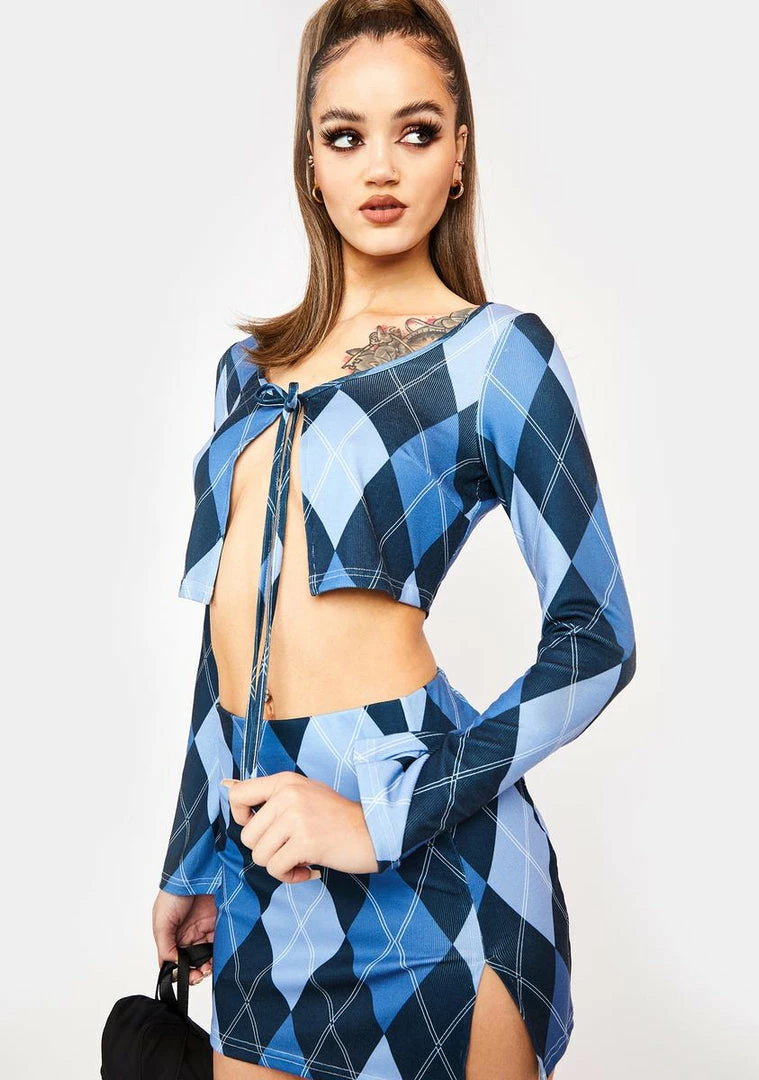 cuz you’re an expert at serving looks! This long sleeve crop top and mini skirt set has a tie front closure, bodycon fit, and an argyle print all over.