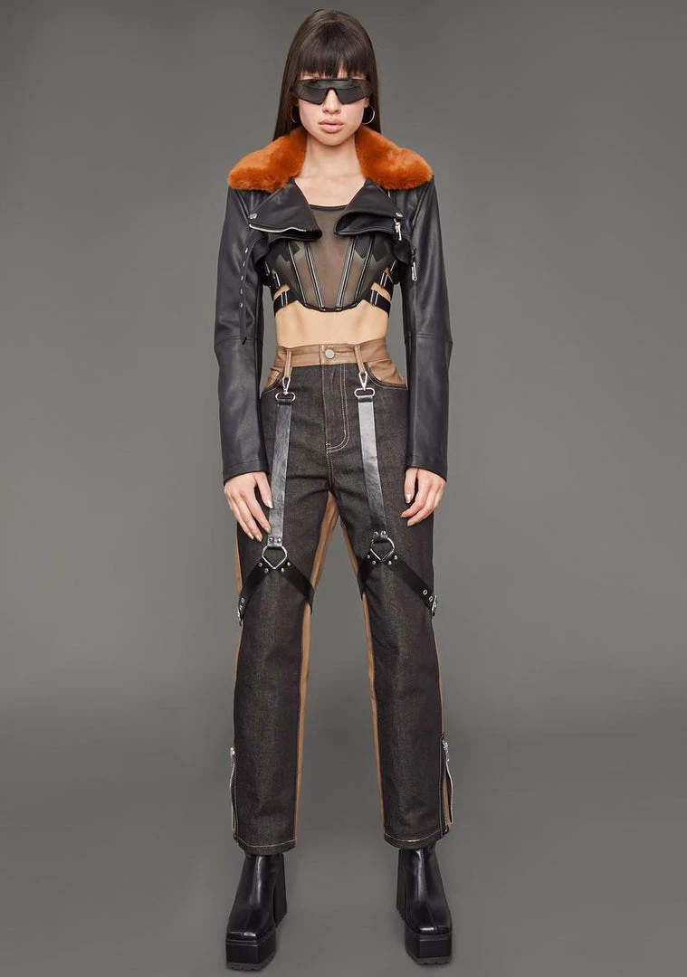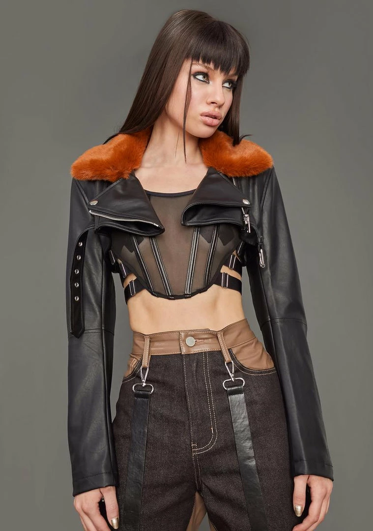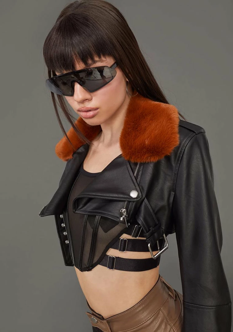 it’s your time to shine. This shrug moto jacket has a vegan leather construction, a faux fur collar, and ribbed stitching accents on the back.