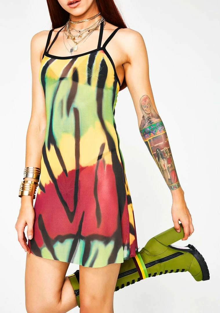 cuz we need to spread all the good vibez. Share ya good vibez in this sheer mesh dress that has a tie dye print all ova.