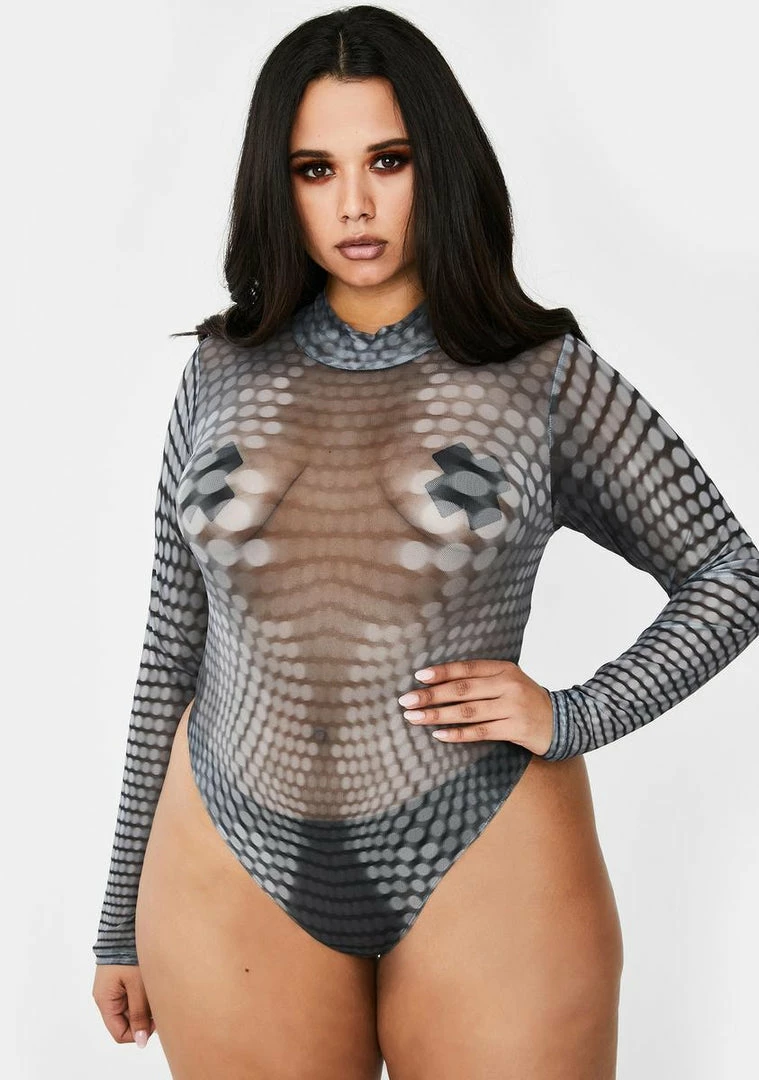 but we act like old money. You are the moment in this xplicit long sleeve mesh bodysuit that has a mock neckline, cheeky high waist fit, bikini snap closures and an epic dot print all ova.