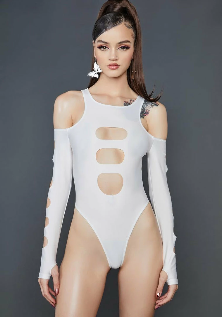 cuz you make them weak. This bodysuit comes with cut out details at front and along the sleeves, thumb hole cut outs, shoulder cut outs, and button snap closures.