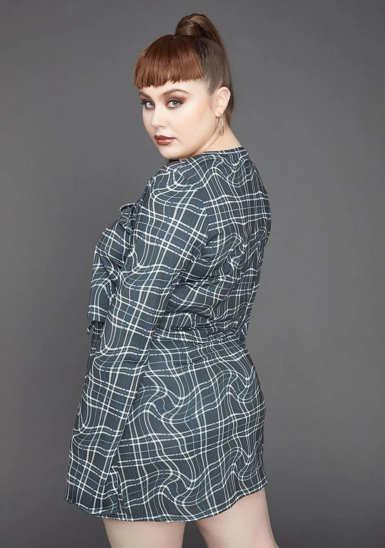 cuz you’re iconic in every way, babe. This wavy plaid print set includes long sleeve crop top with a front tie closure and a high waisted skirt with a side slit.
