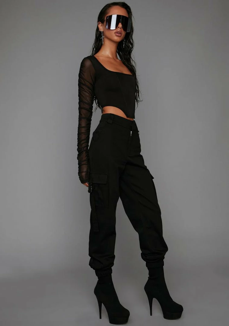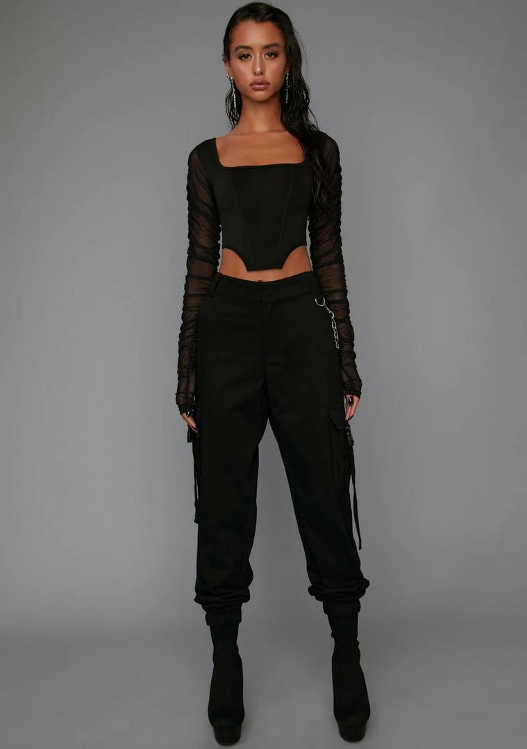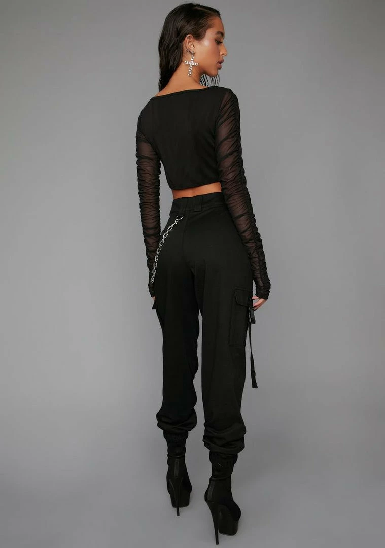for doing what it takes. These high waisted jogger pants have cargo pockets on each leg, a chain constructed into the wait and a button-zipper closure.