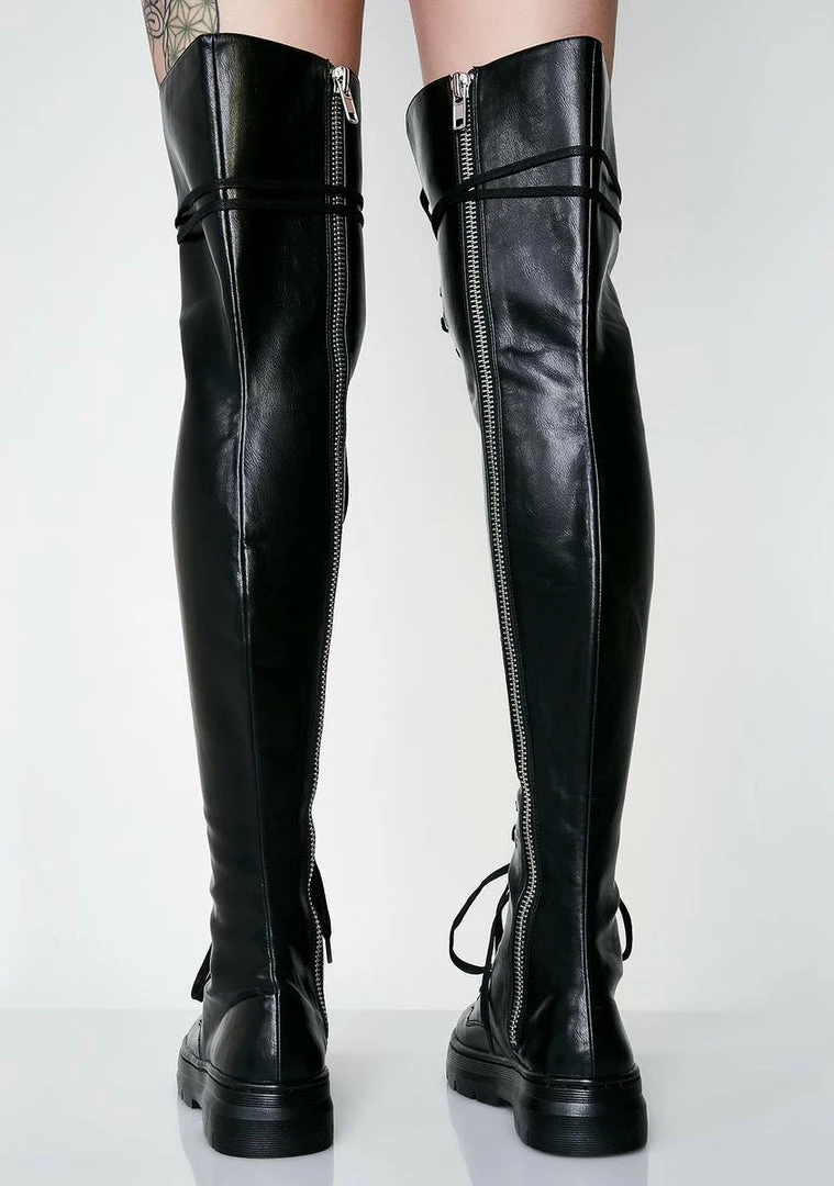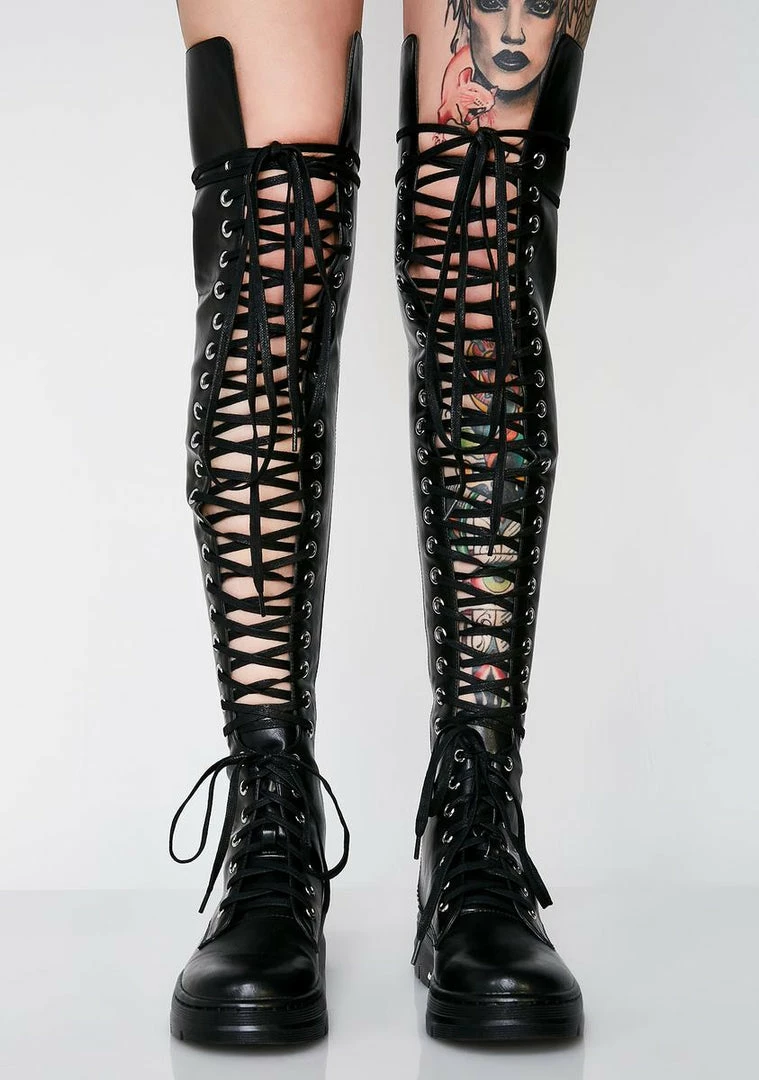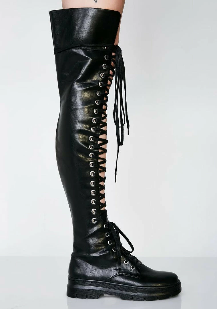 cuz you marchinâ to steal ya boo. Get what ya want with these vegan leather boots that has a lace-up detail on the front and a zip closure on the sides.
