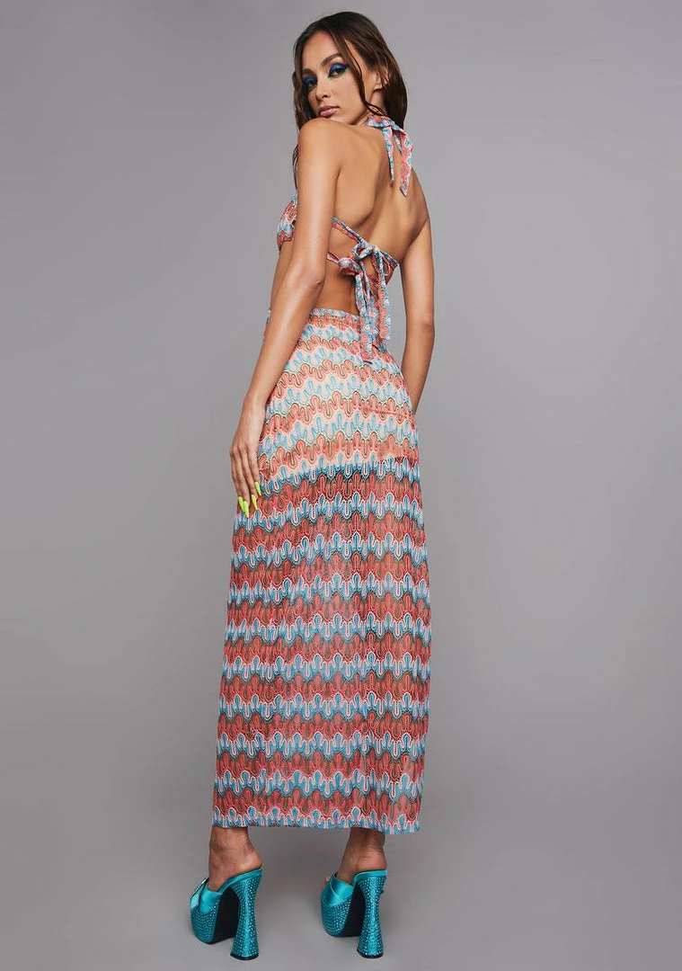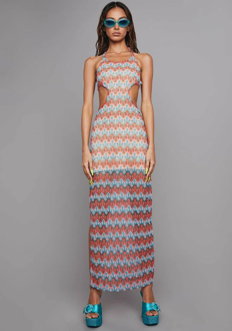 cuz you want that glam tan! This maxi dress has a sheer crochet construction with a wavy print all over, cut-outs on the sides, a hidden side zip closure, and adjustable tie back straps.