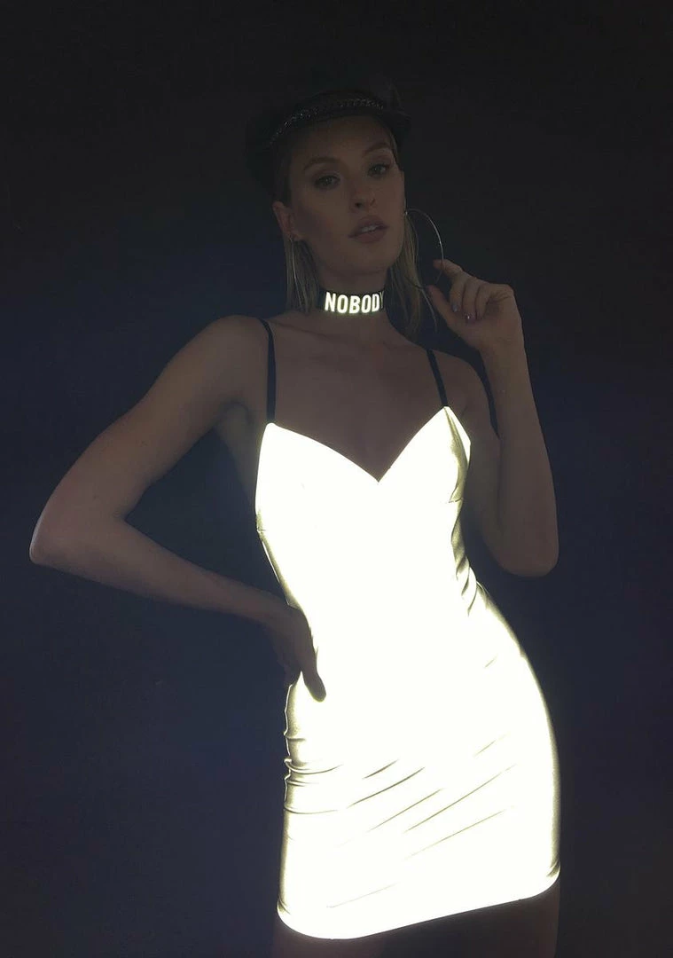 cuz youâre the realest of emâ all. Stunt on all ya fake friends in this bodycon mini dress that has a v neckline, a reflective shine all ova and adjustable straps.