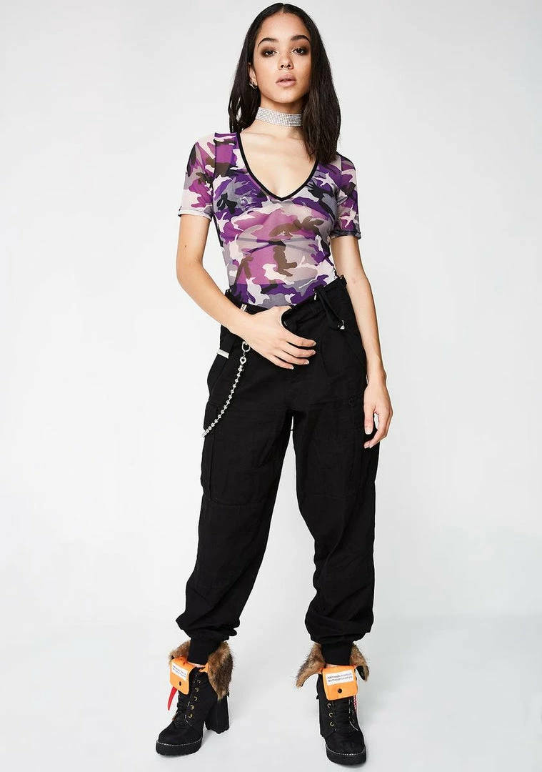 cuz youâll take anyone on. This sheer bodysuit has a purple camo print, v-neckline, medium coverage backside, and a pull on design.