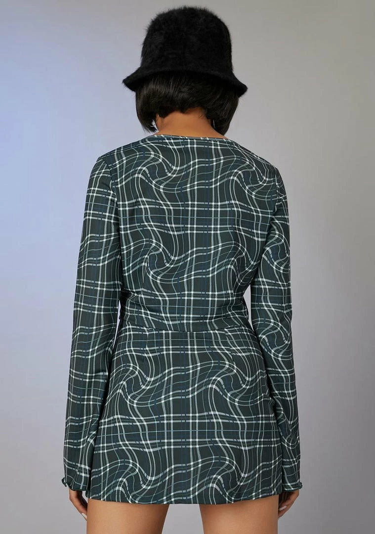 cuz you’re iconic in every way, babe. This wavy plaid print set includes long sleeve crop top with a front tie closure and a high waisted skirt with a side slit.