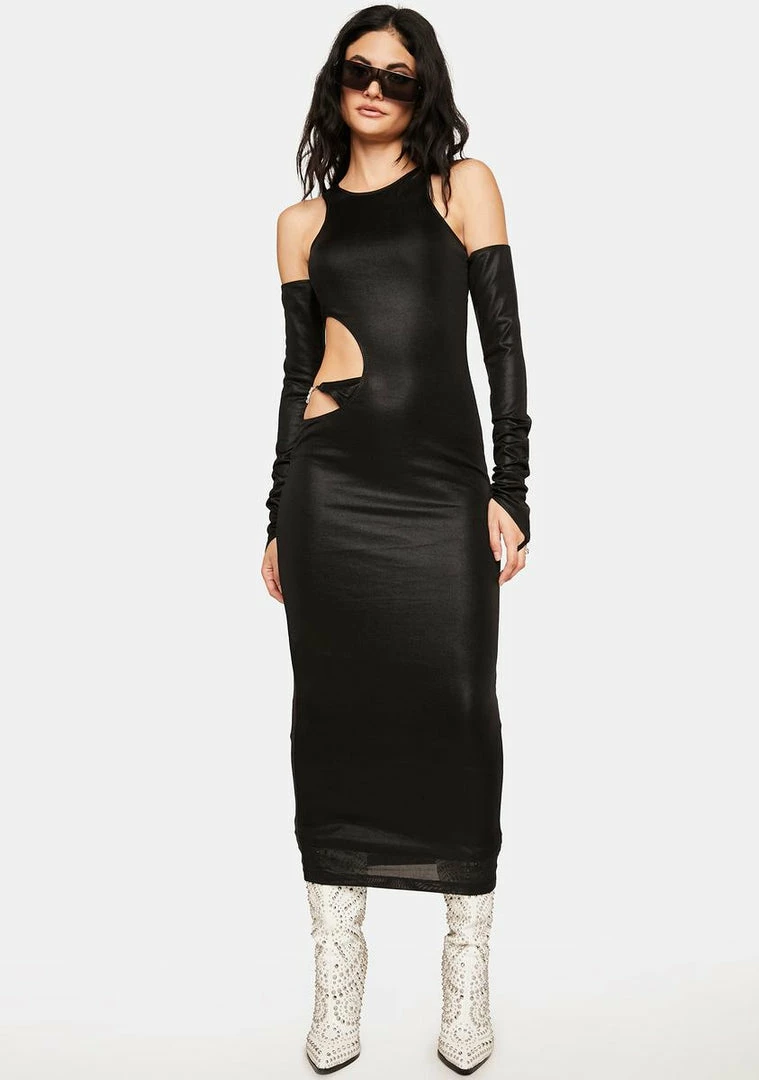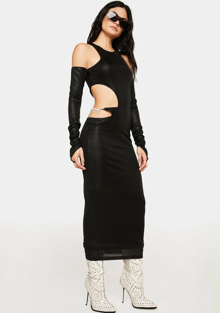 cuz you’re the one on their radar, babe. This maxi dress has a cut-out construction with a built-in thong detail, a bodycon silhouette, and matching long fingerless gloves.