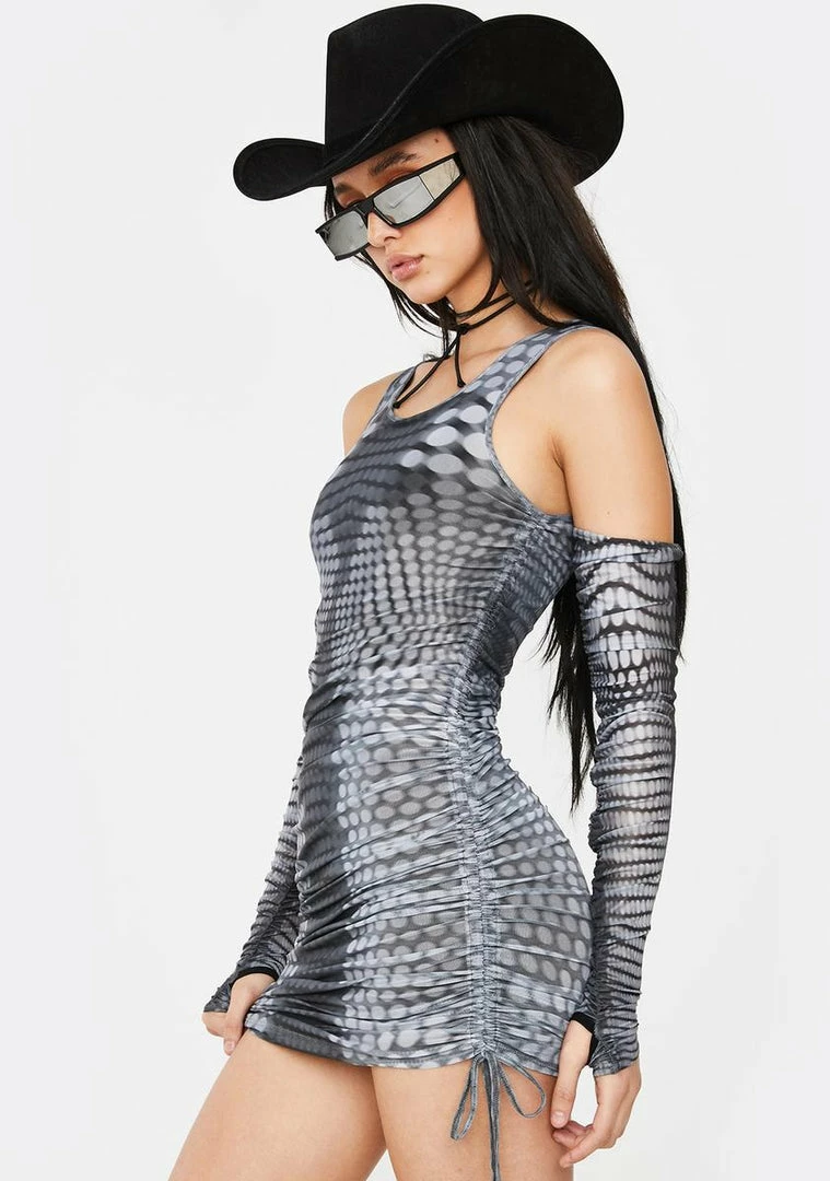 but we act like old money. You are the moment in this xplicit bodycon mesh dress that has matching long sleeves, thumb holes to count yer checks, ruched sides and an epic dot print all ova.
