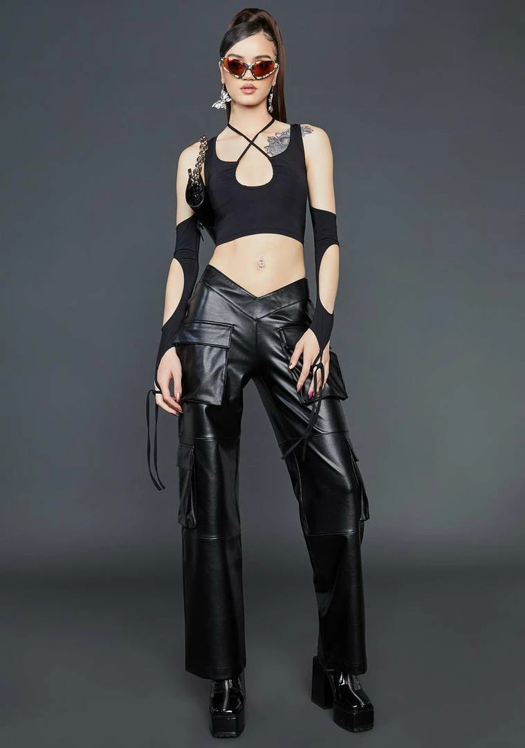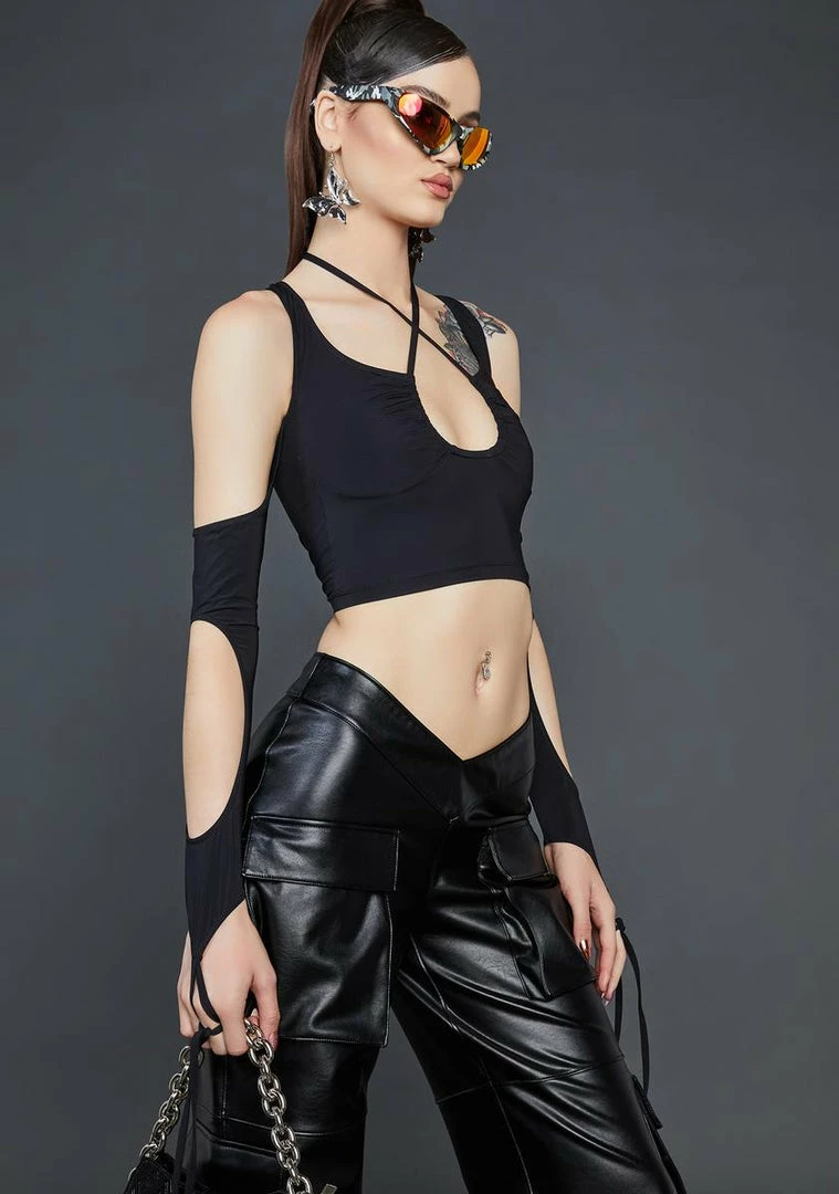 cuz not all attempts lead to victory. Try again in this long sleeve crop top that features cold shoulder and forearm cutouts, a plunging neckline with halter self-ties, and self-tie finger holes.