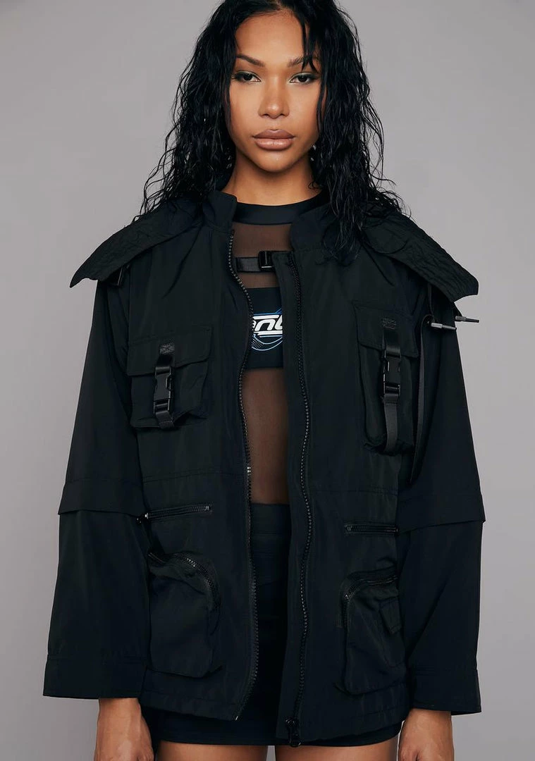 cuz you’ve moved on to bigger and better. This vest jacket has a large pullover hood, exterior pockets with buckle straps, an oversized fit, a front zipper closure, and detachable sleeves to convert the jacket into a vest.