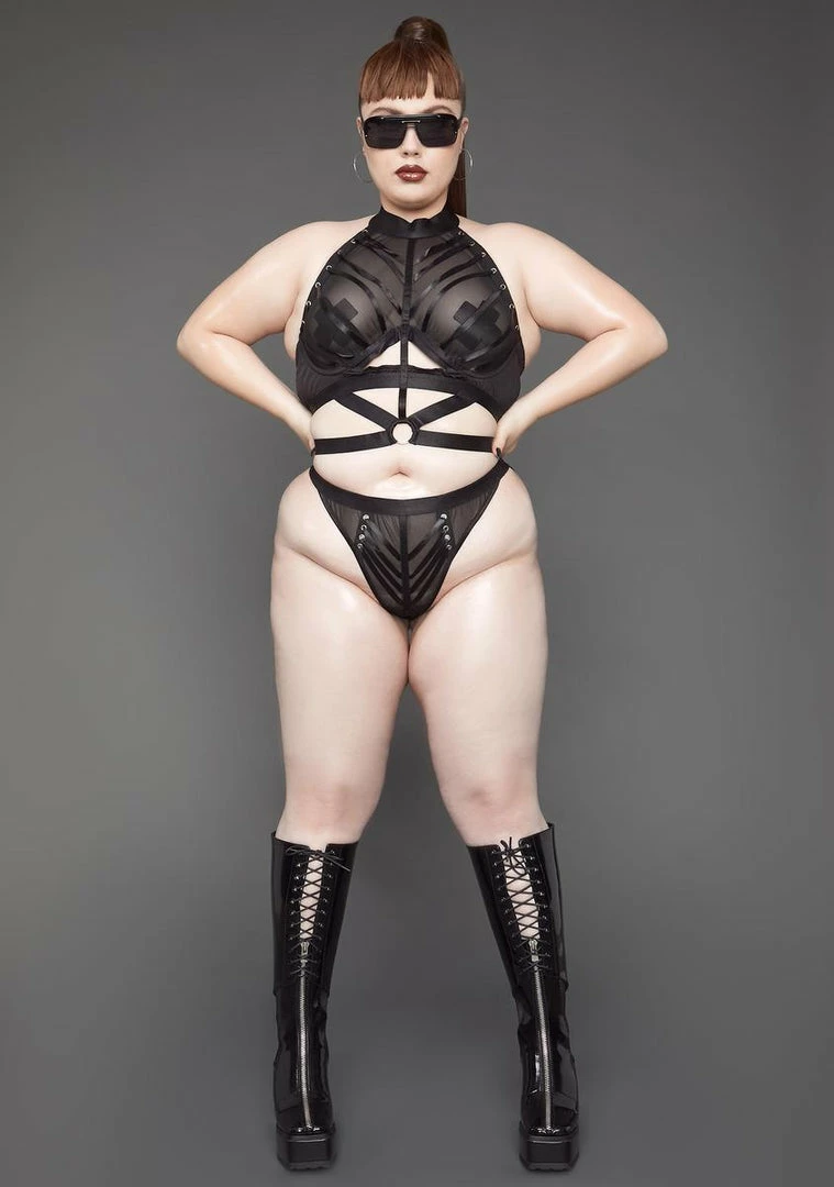 you’re the life of the party. This two piece lingerie set includes a high neck crop top with a mesh bust with ribbon ties and cross straps and a matching pair of cheeky panties.