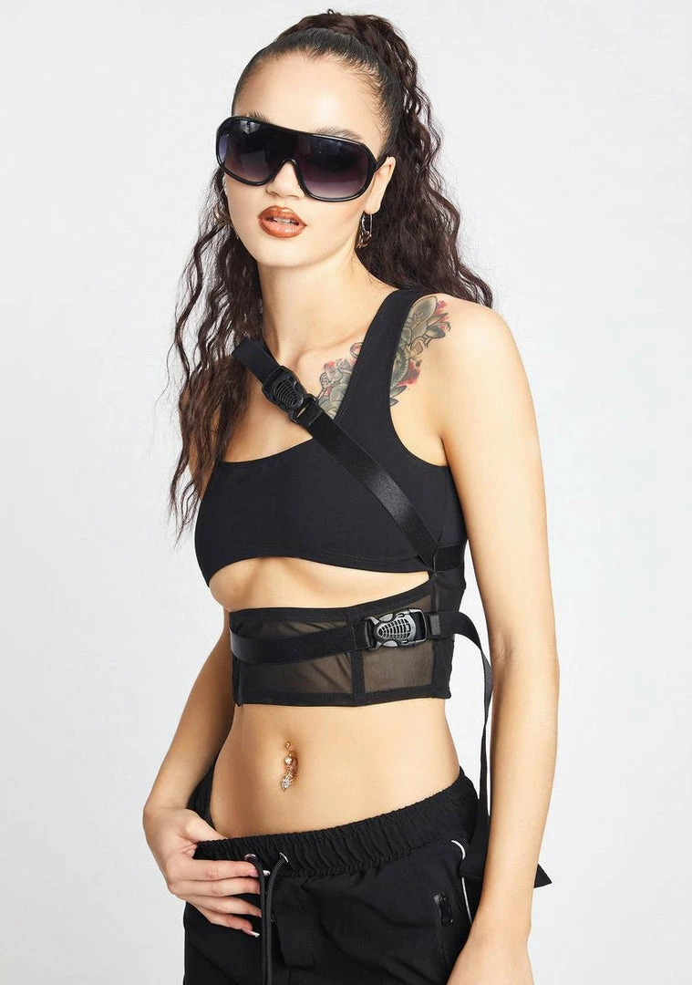 does it get lonely at the top? This corset tank top has utility buckle straps, an underbust cutout, contrast mesh panels, and a square neckline.