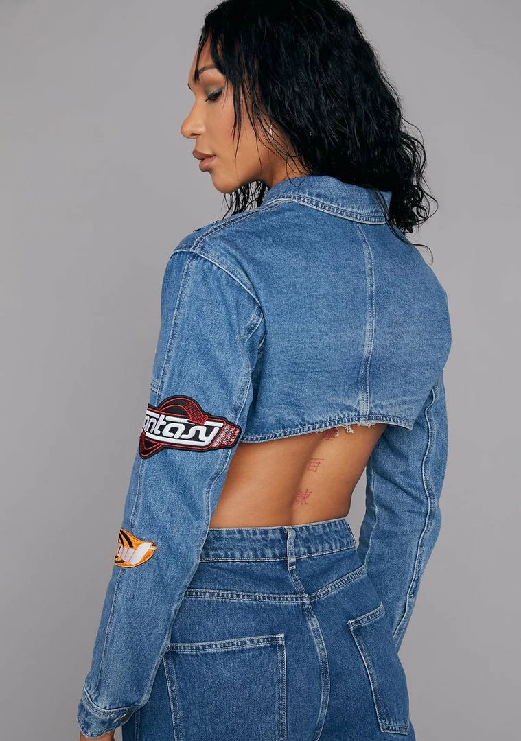 cuz you put in the work. This denim jacket has a medium wash, an ultra cropped fit, front button closures with a collared neckline, and decorative embroidered patches all over.