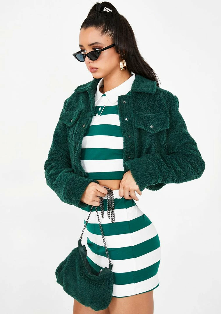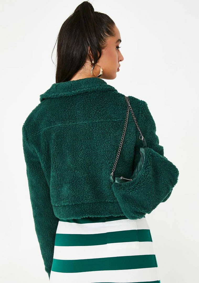 got ya lookinâ like yew own the place, bb girl. Youâre the latest obsession in this dope AF cropped jacket Nâ purse set that has a supa fuzzy construction, a chrome chain shoulder strap and button up Nâ zip closures.