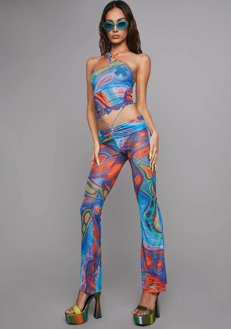 cuz you’ve got hypnotic habits! This asymmetrical crop tank and strappy flared pants set has a mesh construction with a colorful trippy print all over, lettuce edge trim, a low rise fit with a built-in panty liner, and adjustable ruched drawstrings.
