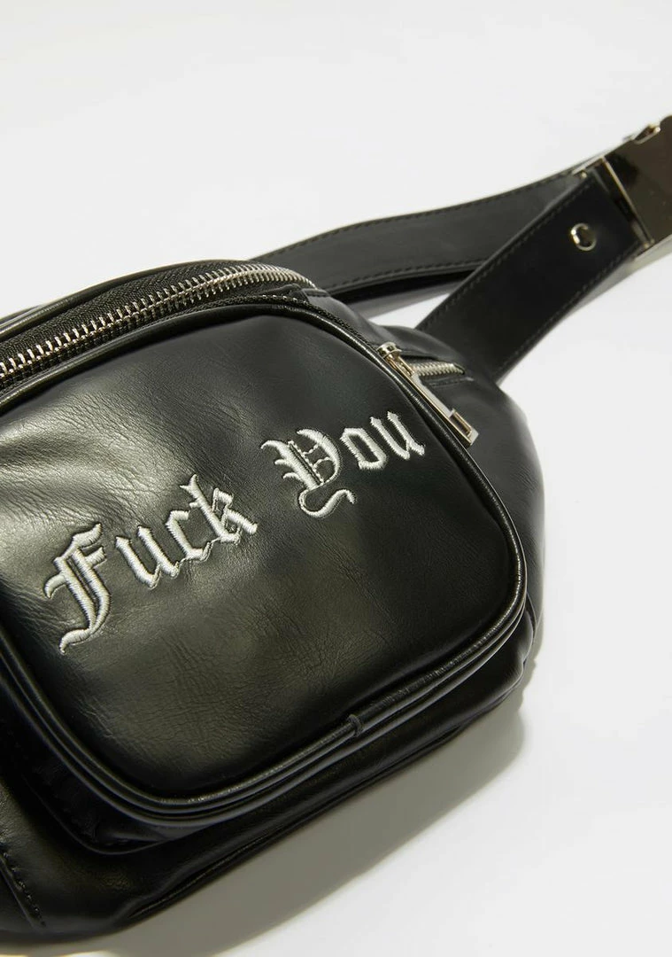 because all you see is dollar signs. This vegan leather fanny pack has a chain strap, zipper packets and old english graphic text on the front that reads, âFuck Youâ on it.