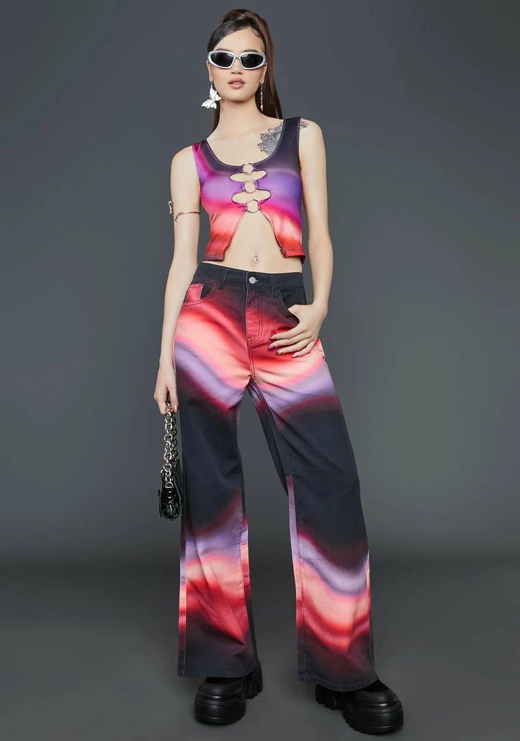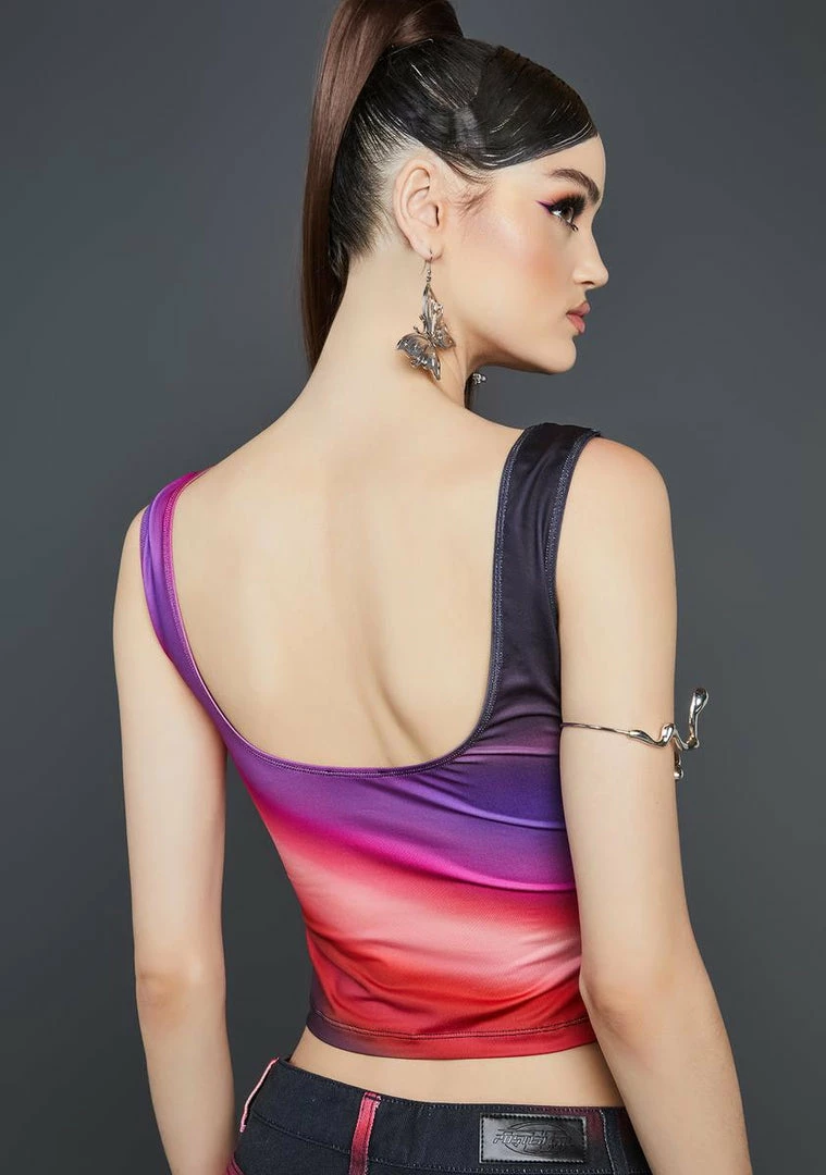 cuz all is fair in love and war. This crop tank top has a scoop neckline, cutouts down the center with O-ring hardware, a split hem design, and a gradient stripe print.