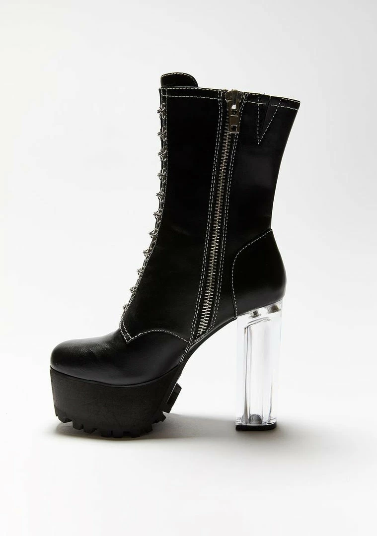 the verdict is in, we hereby declare u a certified BAD BISH bb! These boots were made for flexinâ on the haters with their clear lucite block heel, vegan leather construction and lace up closure with hook and eye latches.