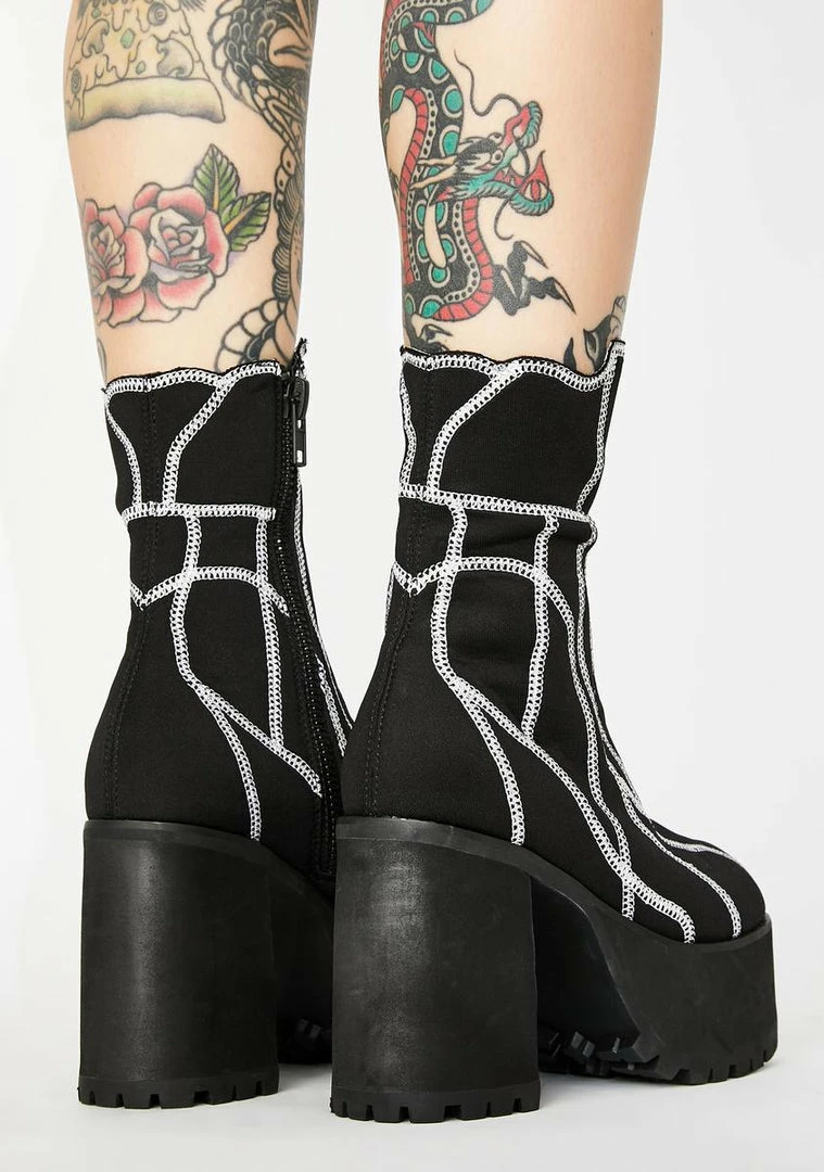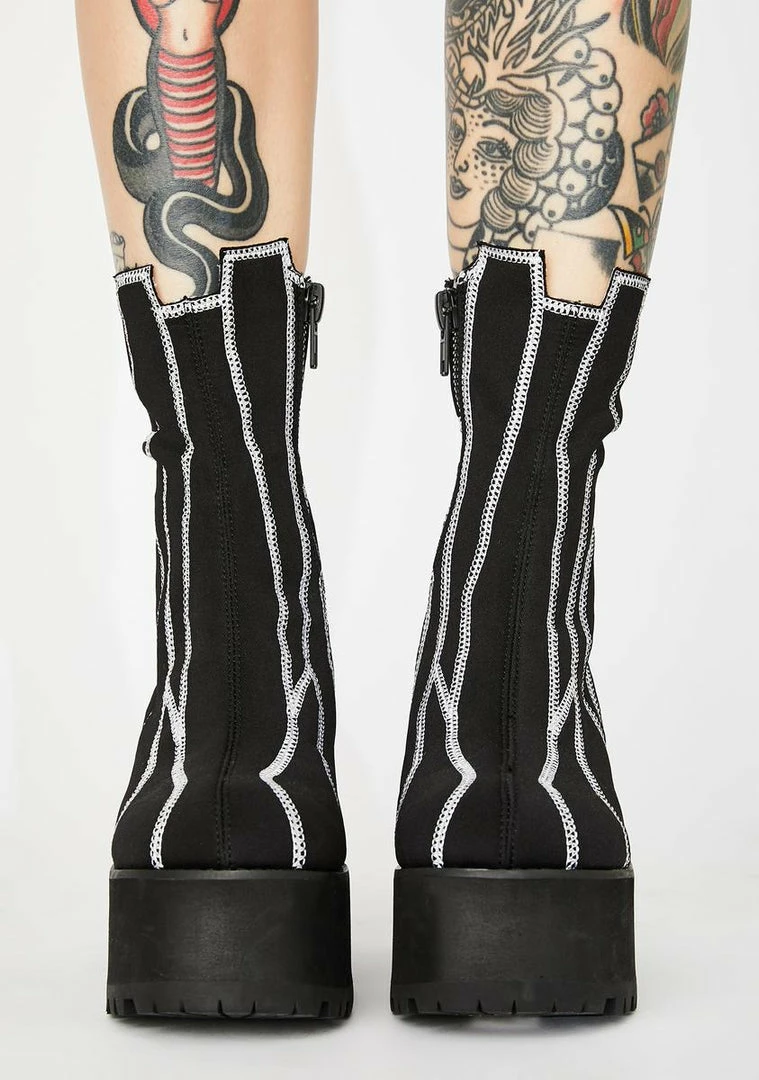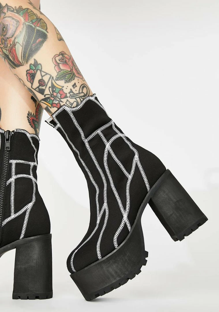 they act like they know people but you got the numbers to prove it, sis. Youâre worth the follow in these baddie platform ankle boots that have chunky block heels, abstract contrast stitching, jagged hems and side zip closures.