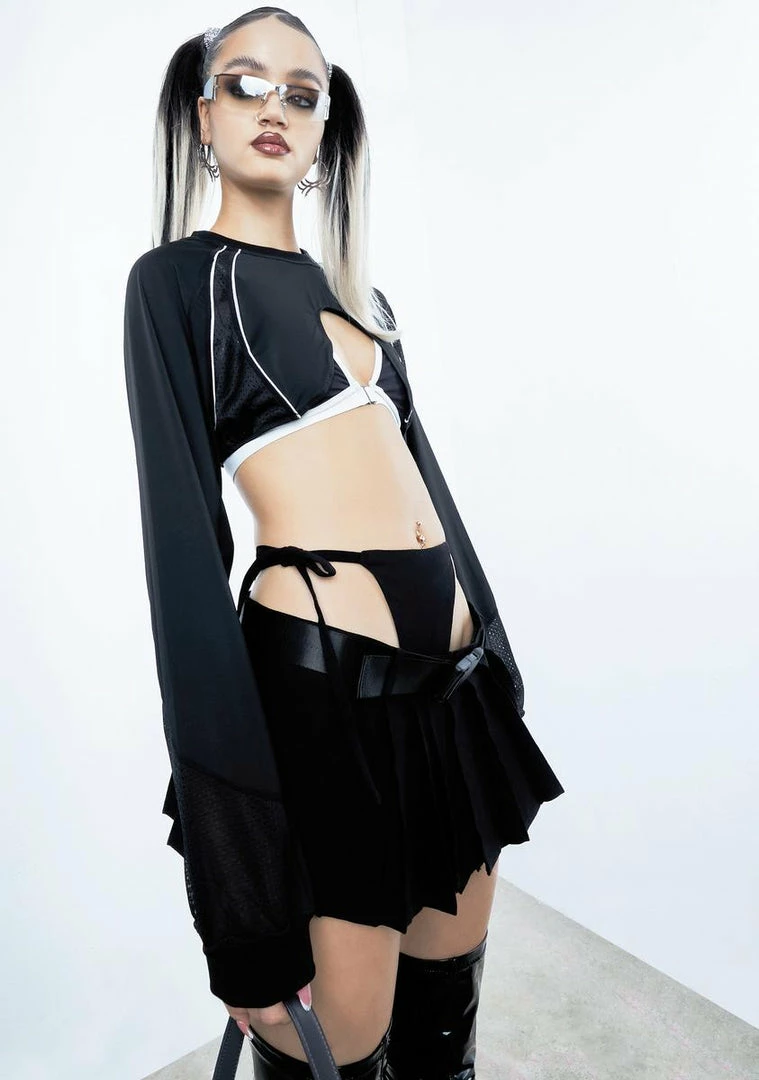 cuz you always score, babe! This sporty set includes a cropped football jersey with lightweight mesh construction and a contrast trim bralette with a front clasp closure & a strappy back.