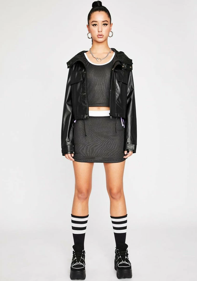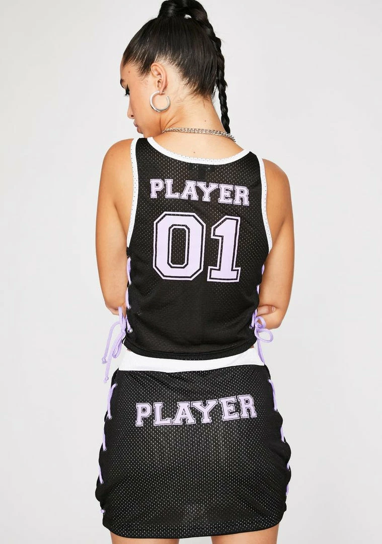 cuz they gotta stop talkinâ all their lame azz sh*t! Theyâll neva score higher than you in this sporty two-piece mesh set that has a lace-up jersey tank and a matching skirt with numba one team graphics on the back.
