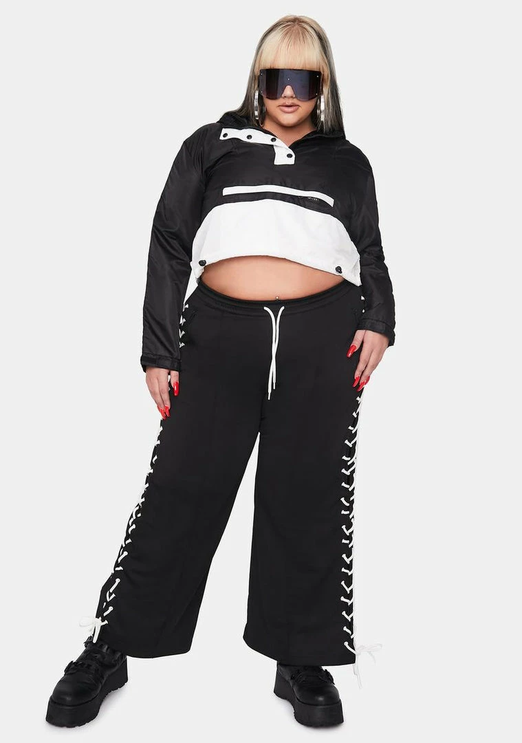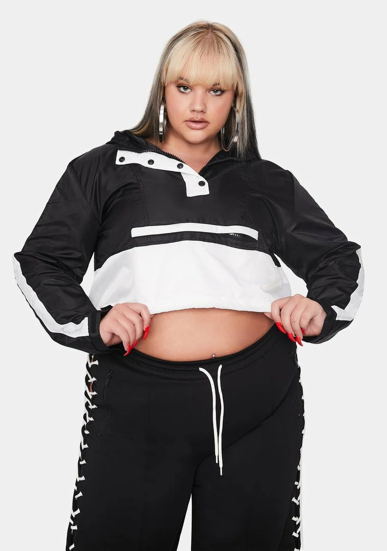 gotcha maxinâ out their credit cards! Play the system in this sporty pullover windbreaker that has a colorblock design, quarter zip neckline with snap button closures, and adjustable bungee cord closures on the sides & hood.