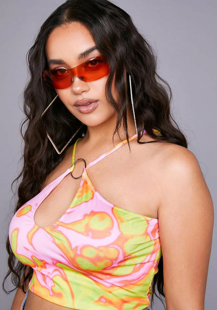 let’s bring it back to the future. This tank comes with an adjustable o-ring detail that can be worn in the front or back, adjustable spaghetti straps, and a swirl print all over.