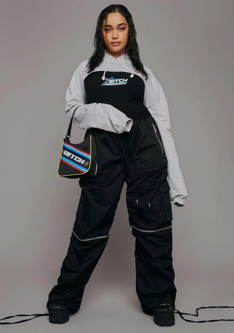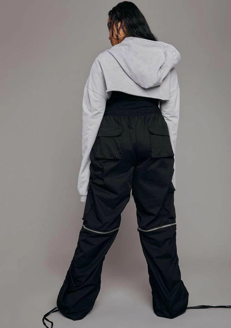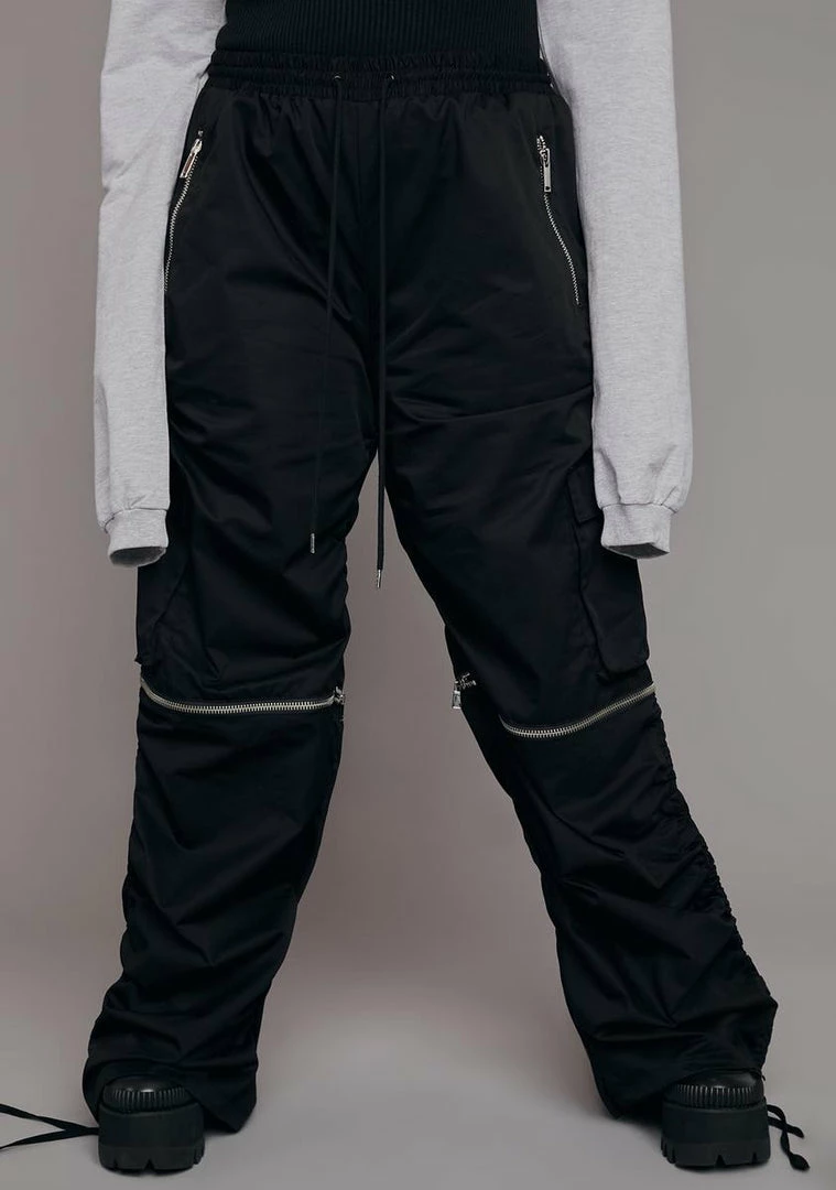 you don’t shy away from a challenge. Come out on top in these wide leg pants have that a drawstring waistband, cargo pockets, a baggy fit, ruching details along the sides with adjustable ties, and zippers at the knees to remove the legs and convert into shorts.