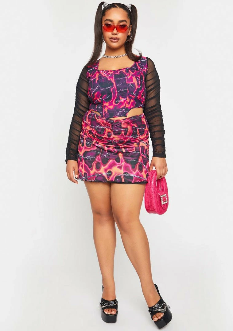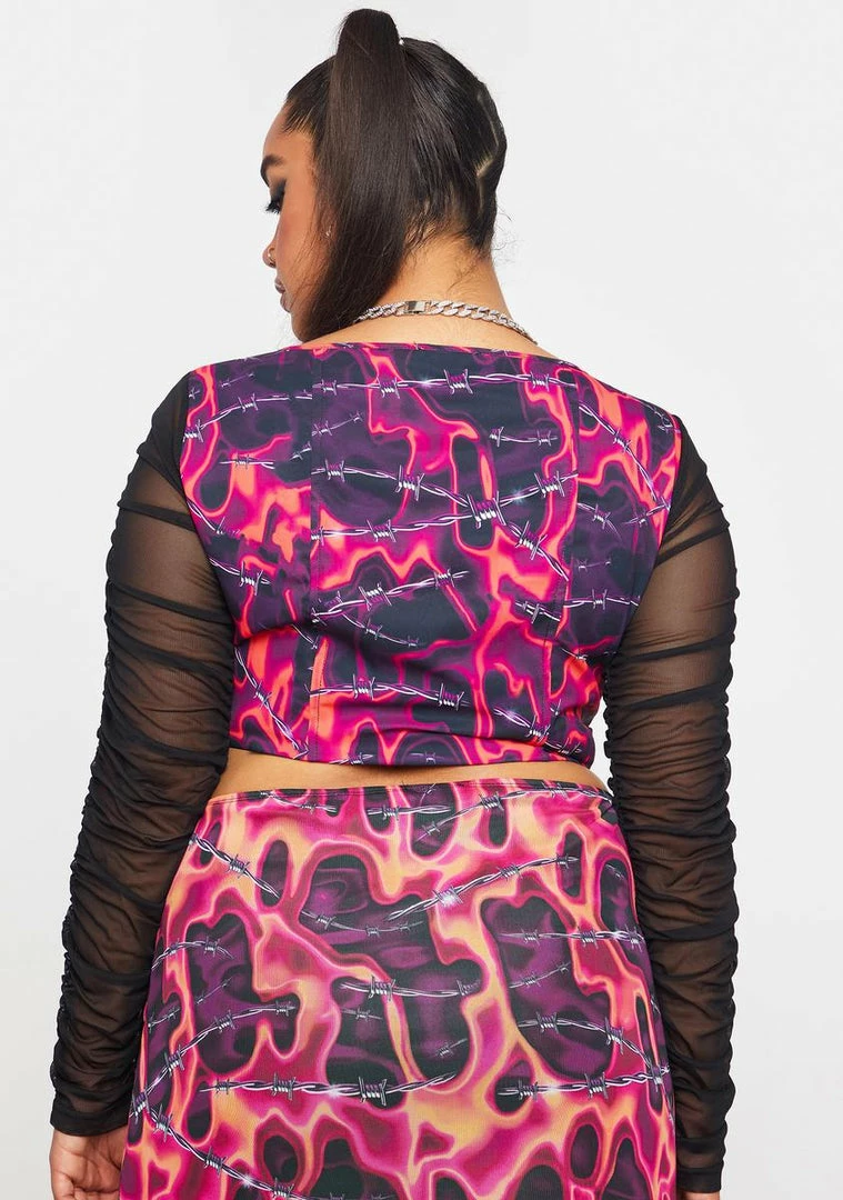 cuz youâre a dangerous diva! This corset crop top has contrast sheer ruched sleeves, a square neckline, and a barbed wire print all over.
