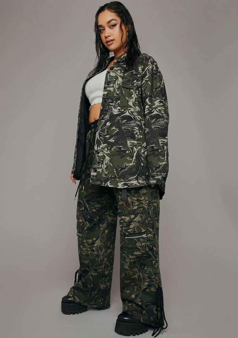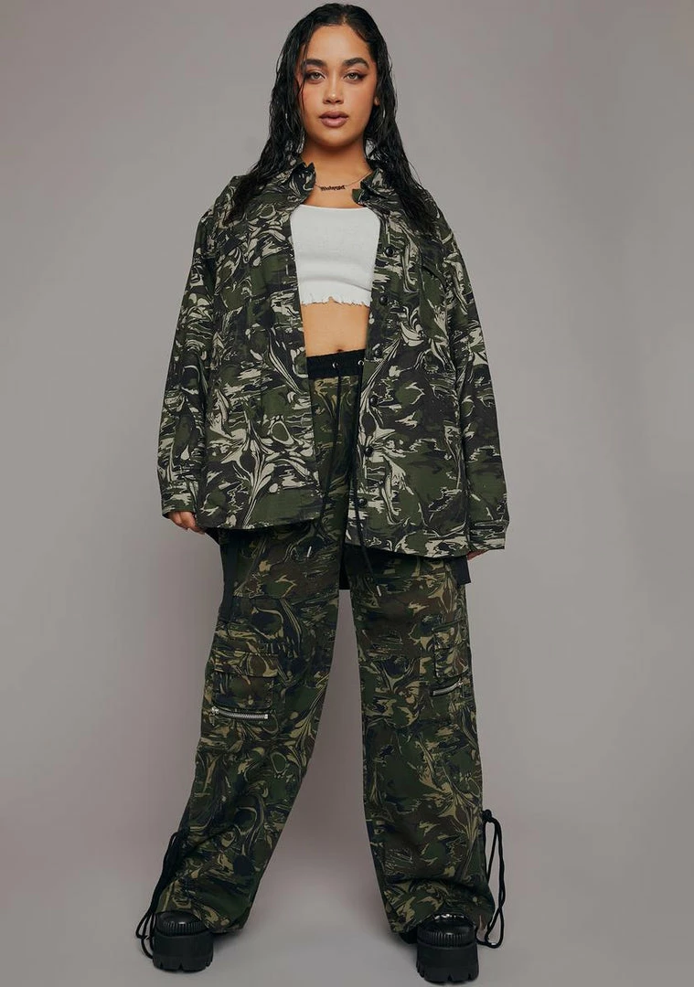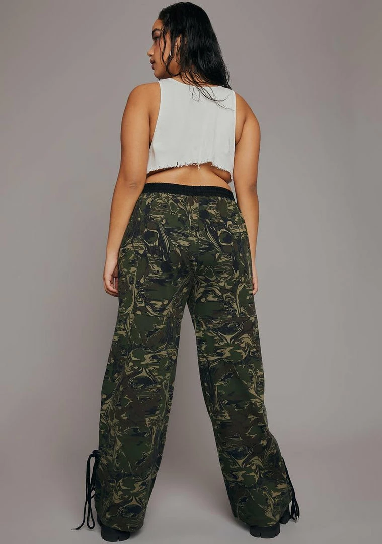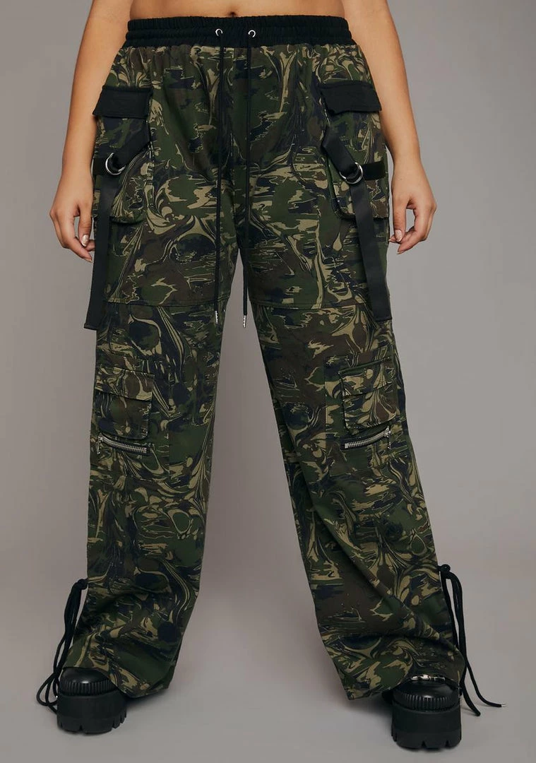 you gotta know who you’re dealing with. These cargo pants have a drawstring waist, a camo print all over, decorative vegan leather buckles, zipper pockets, and adjustable ties at the ankles.