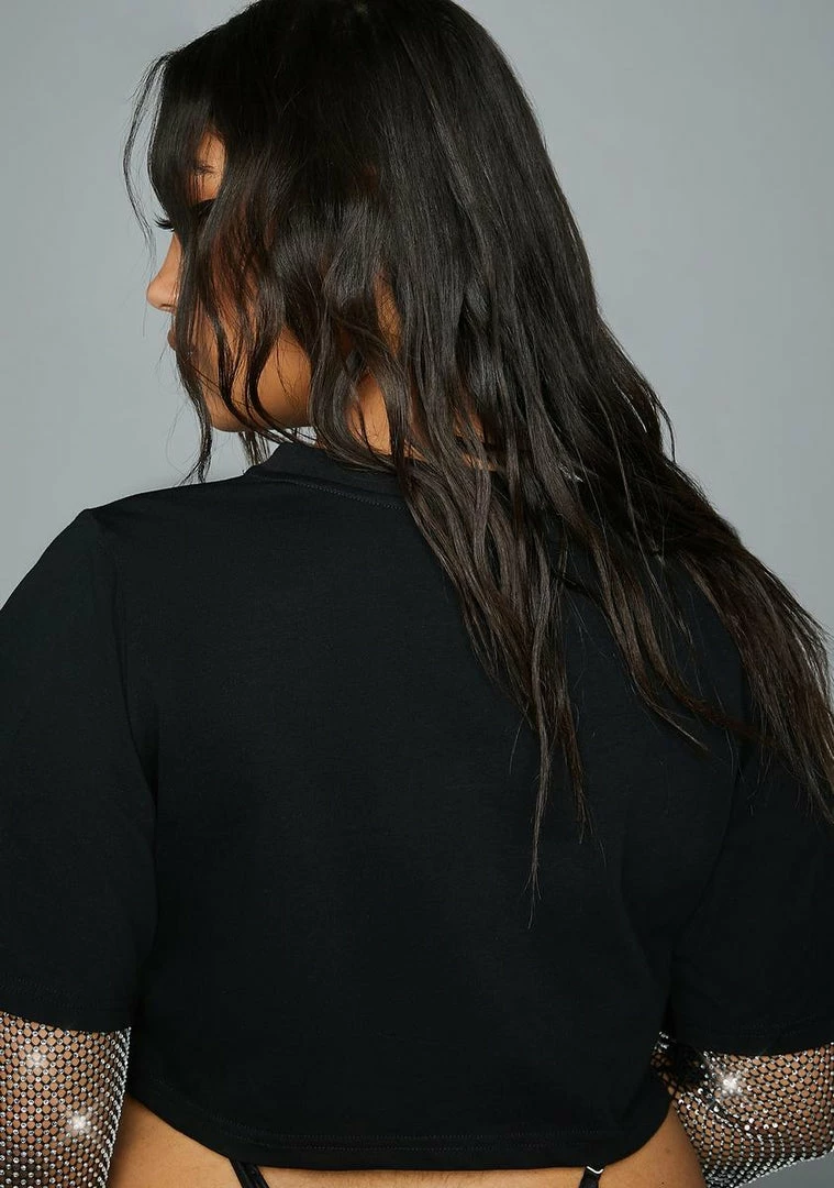 cuz they’ll never forget your name. This “pretty lethal” graphic tee has a boxy cropped fit, fishnet sleeves with rhinestone embellishments, and a crew neckline.