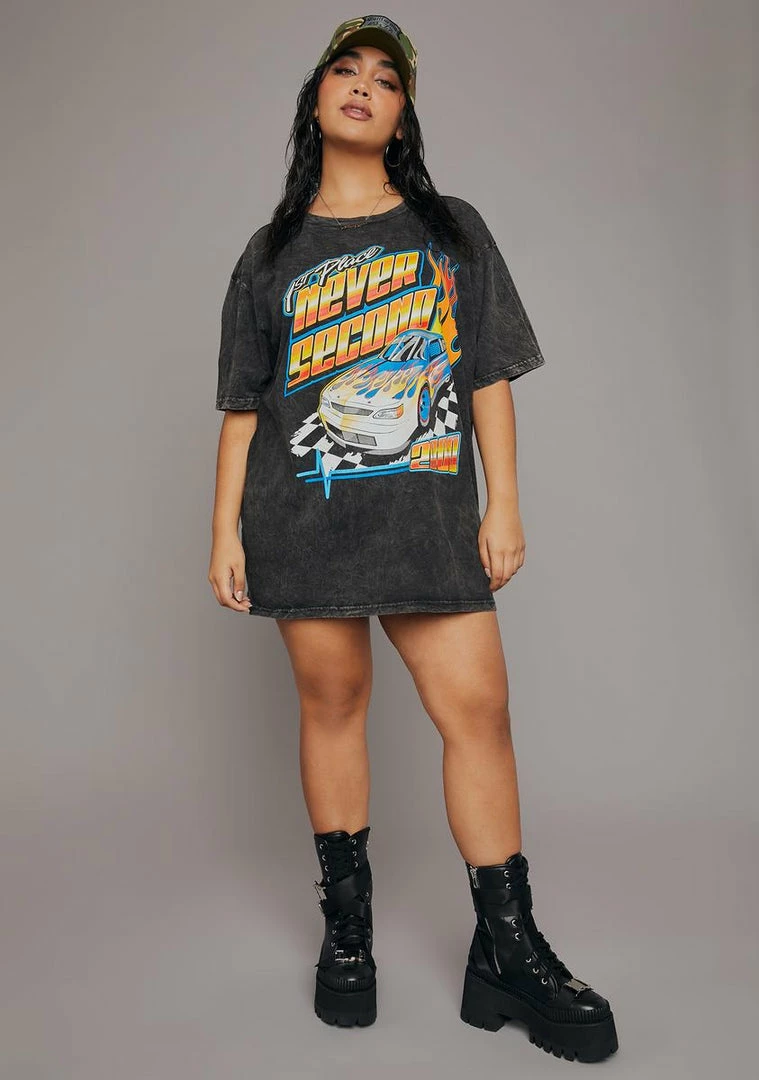 cuz you really get me going. Bet on me in this oversized graphic tee with short sleeves, a washed look, and a flaming car with “1st Place Never Second” printed on the front.