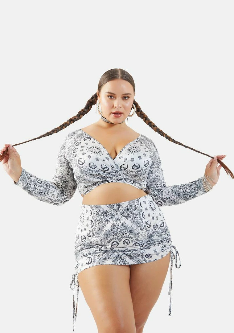 cuz anything goes in the wild wild west. Ride out in this long sleeve crop top with a wrap tie design and all over bandana print.