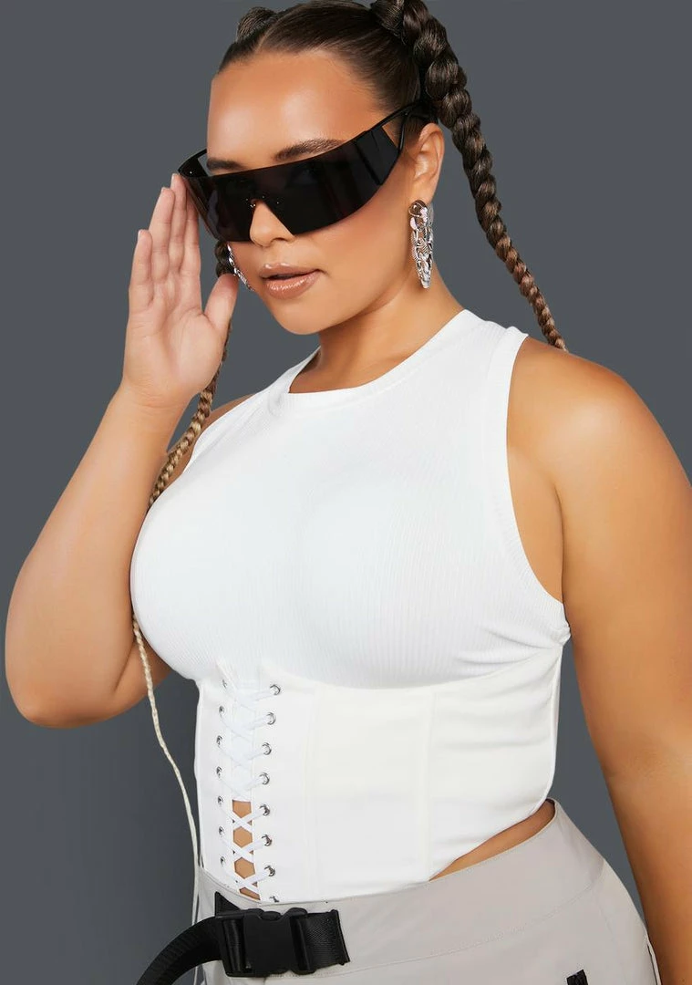 cuz you’re on a mission. Carry on in this cropped tank top that has a lace-up corset-style waistband, a stretchy ribbed fabrication, and a zipper closure at back.