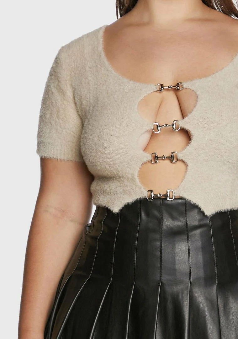 cuz you never had it so good. This sweater has a super soft fuzzy knit construction, a scoop neckline, short sleeves, metal hardware detailing on the front, and a cropped fit.
