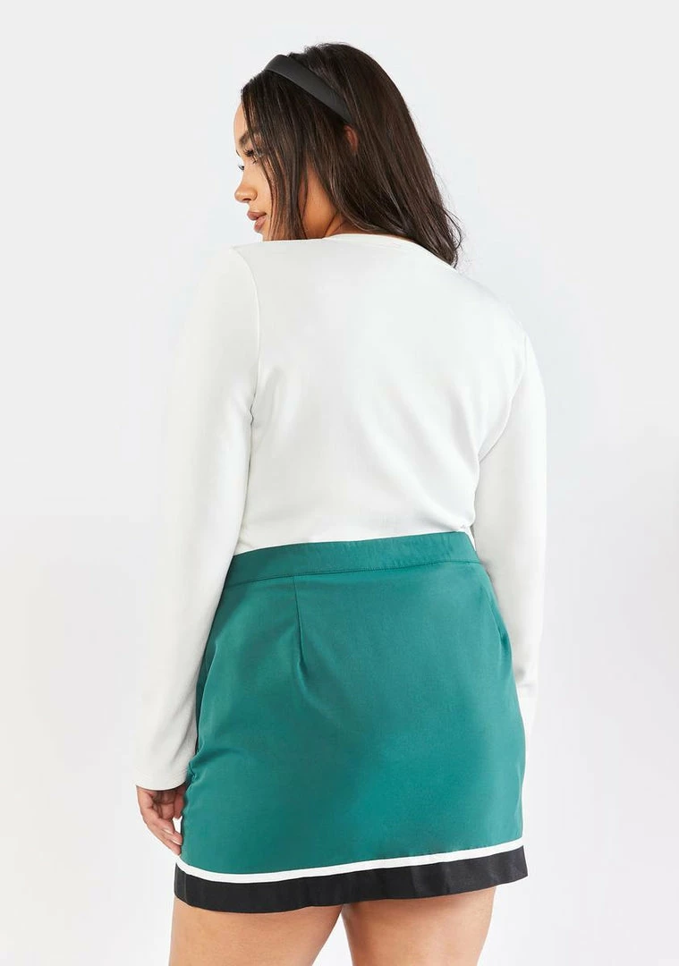because everyone follows your lead. This cheer style mini skirt has striped detailing on the bottom, a high waist fit, and a side zip closure.