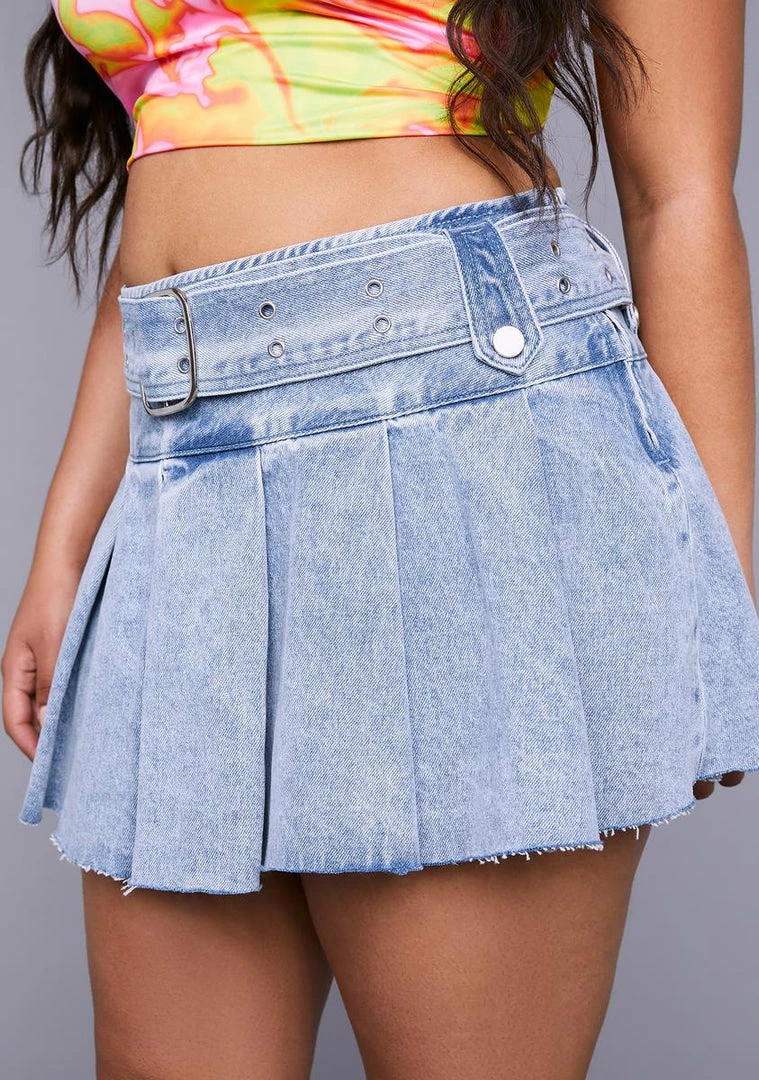 cuz you’re the best of the past and the future. This skirt comes in a denim construction, with pleating, a raw hem, and a belt detail.
