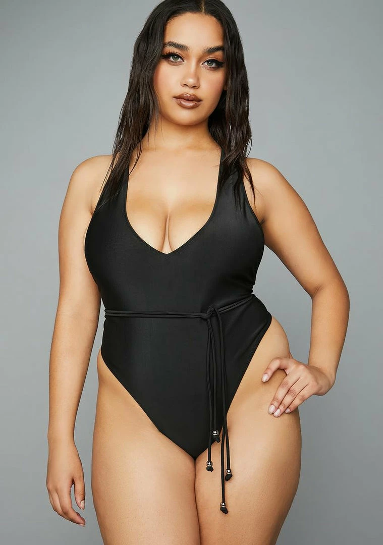 cuz it’s time to lay under the palm trees! This one-piece swimsuit has a plunging neckline, a high leg cut, a strappy criss-cross back design with a logo detail, and extra long wrap straps with metal ball details.