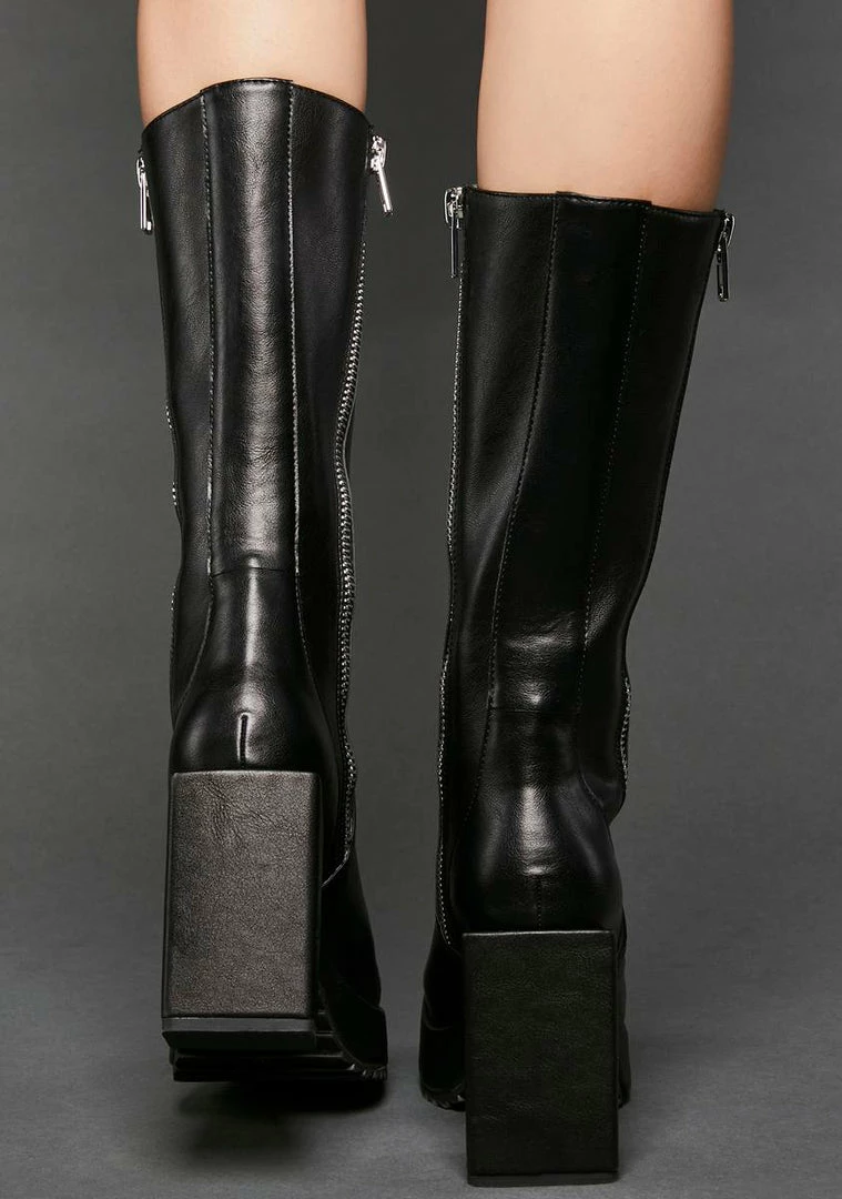 cuz you’re no angel. Playtime’s over in these calf-length boots that feature a vegan leather construction, zipper closures at both sides, a treaded outsole, and a future-forward chunky block heel.