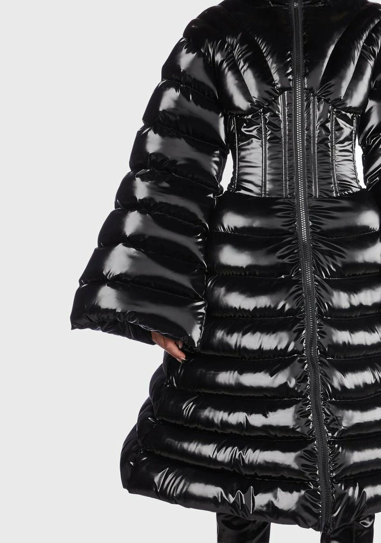 cuz it’s time to level up your look. This knee-length coat has a channel-quilted puffer construction, waist-hugging boning, a fixed hood and stand collar, long bell sleeves, and a front zip closure.