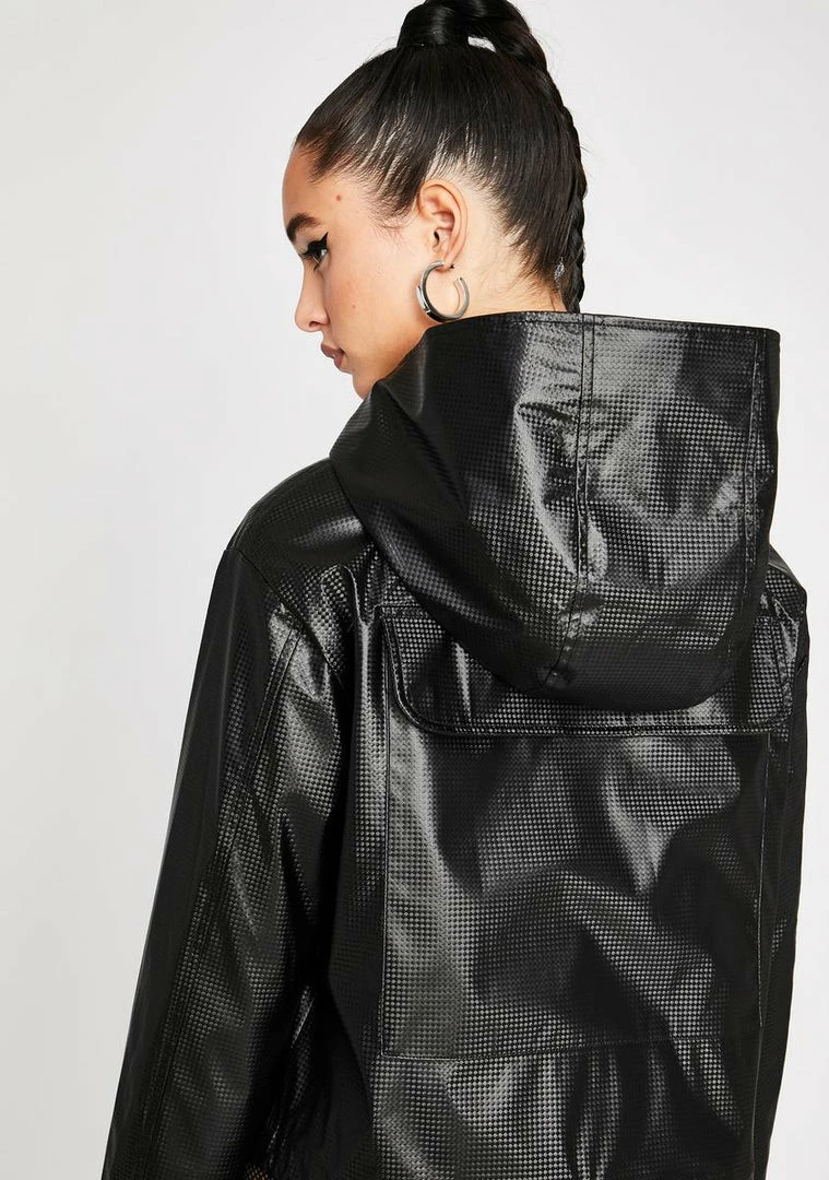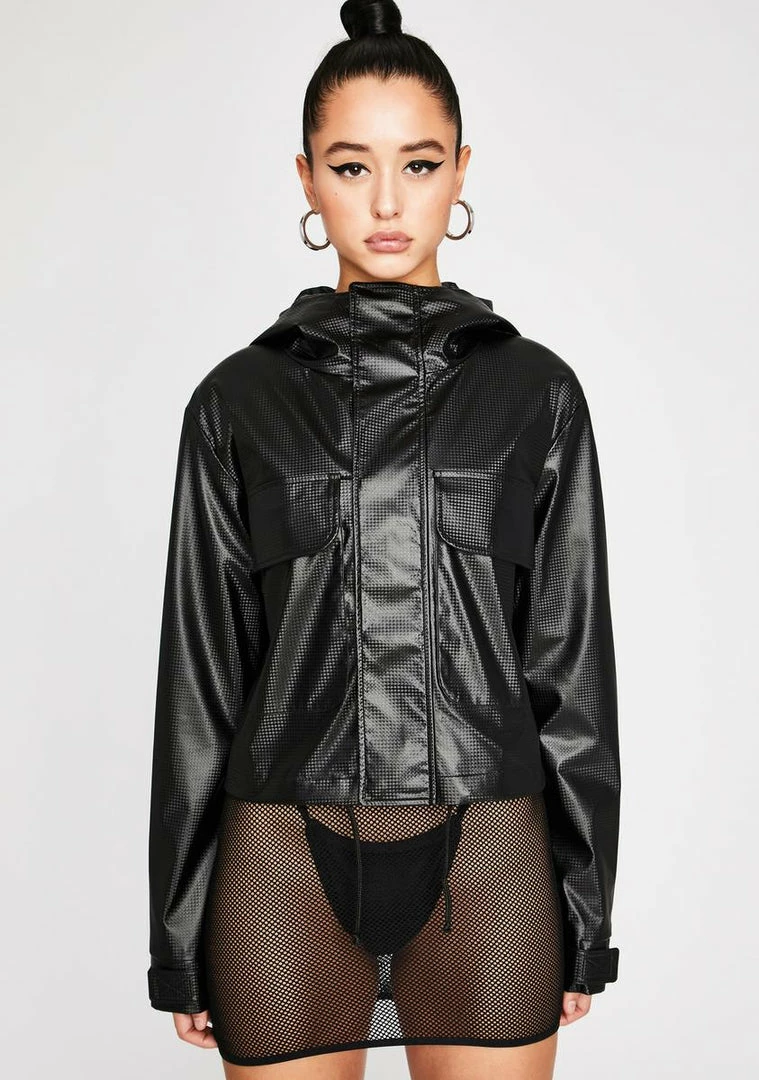 cuz the only way is up, babygirl! They fall behind while you climb the ranks in this hooded windbreaker jacket that has a perforated vegan leather construction, a drawstring waistband, button Nâ zip closures and big cargo pockets on the front Nâ back.
