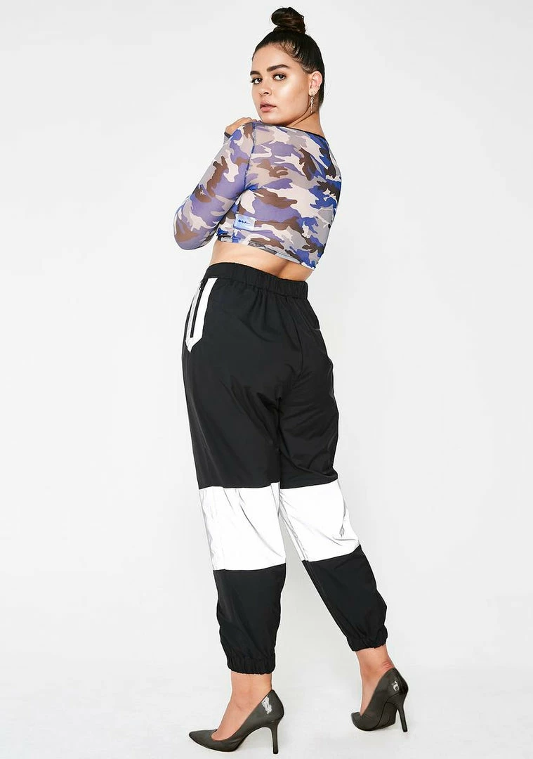 cuz you gleaming in their face, bb. Let emâ know youâre in the room with these loose pants that have a reflective panel on the knees, zip pockets with a reflective trim on the sides and a zip closure.