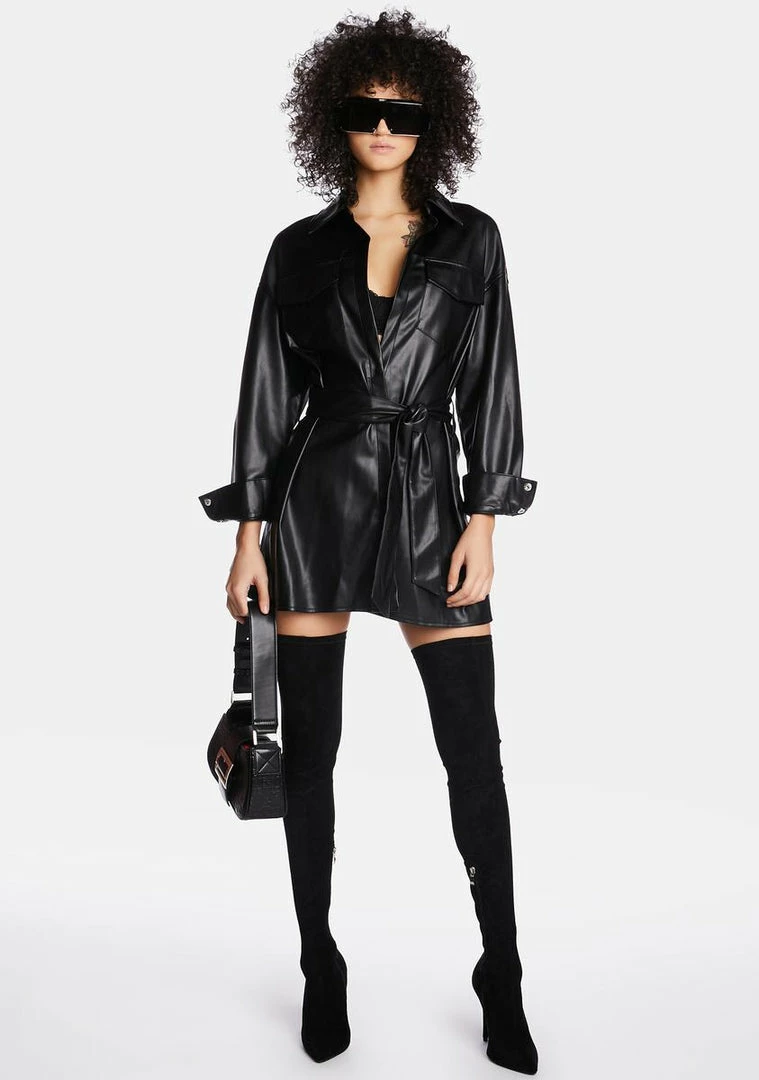 do you, whether they like it or not. This mini dress has a soft vegan leather construction, a collared neckline, chest flap pockets with snap button closures, a front snap button closure, and adjustable belted waist ties.