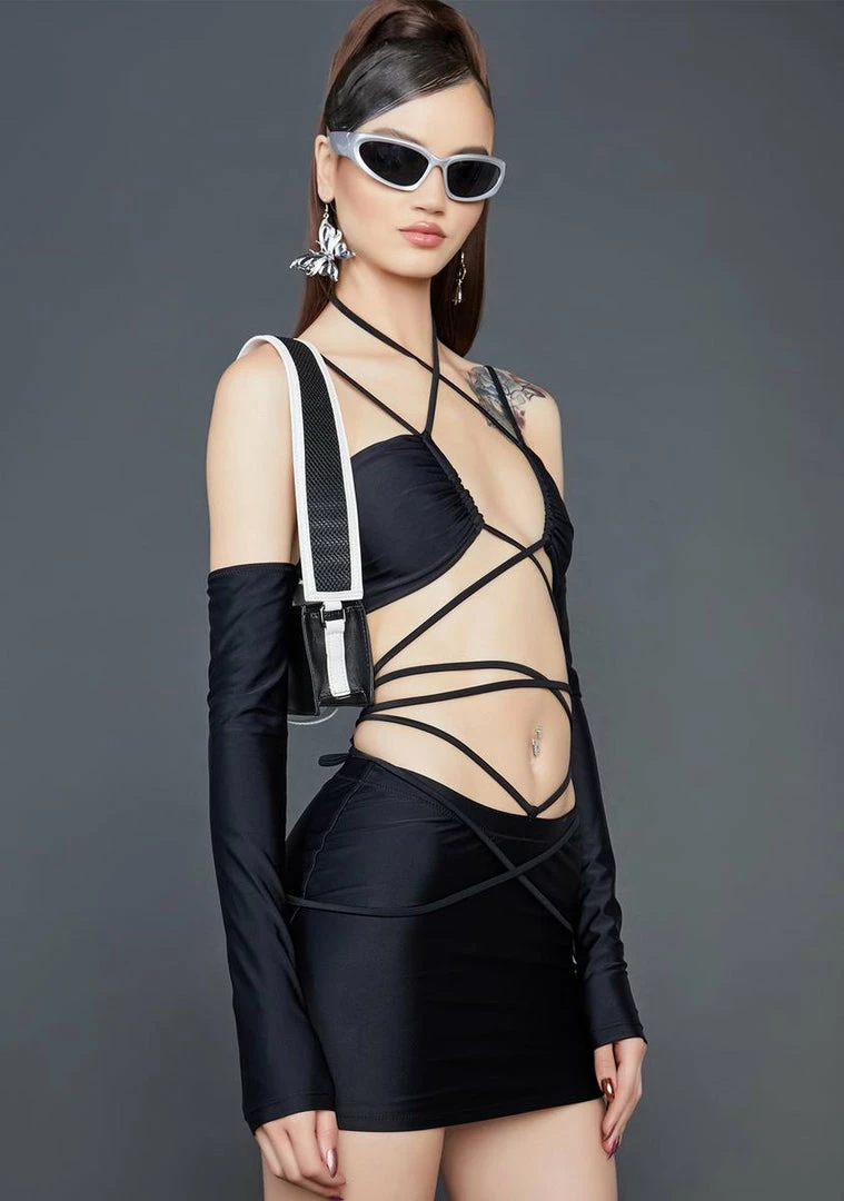 cuz you deserve it. Show them your worth in this skirt set that features wraparound self-ties at the waist, adjustable halter ties, matching opera-length gloves, and a low-rise mini skirt.