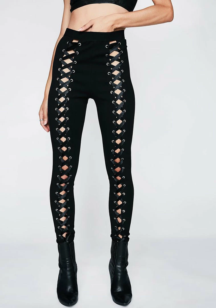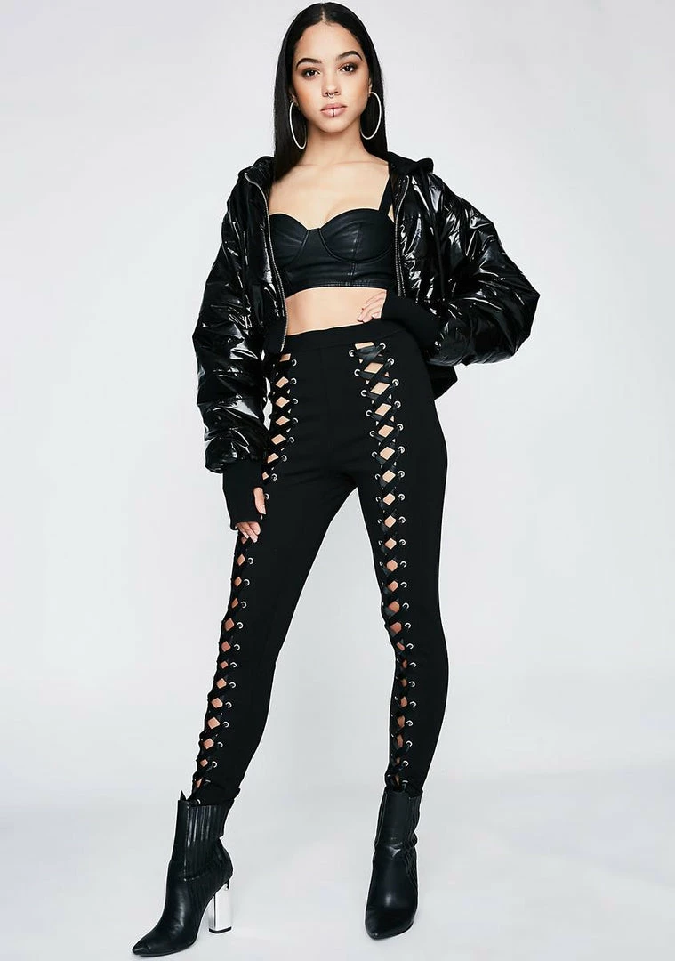 cuz they already know who you are. These black leggings have satiny lace-ups on both legs and a high waisted fit.